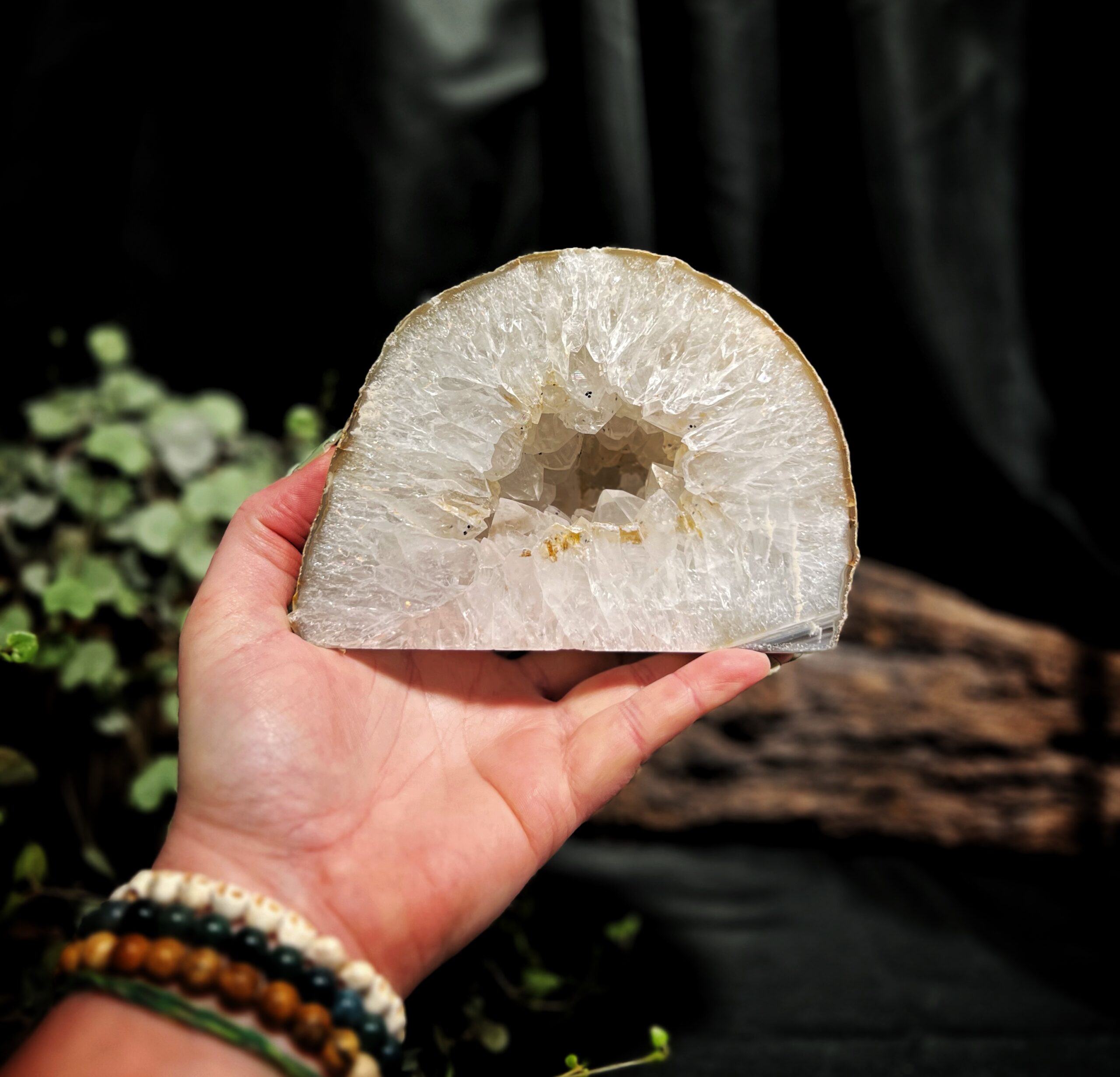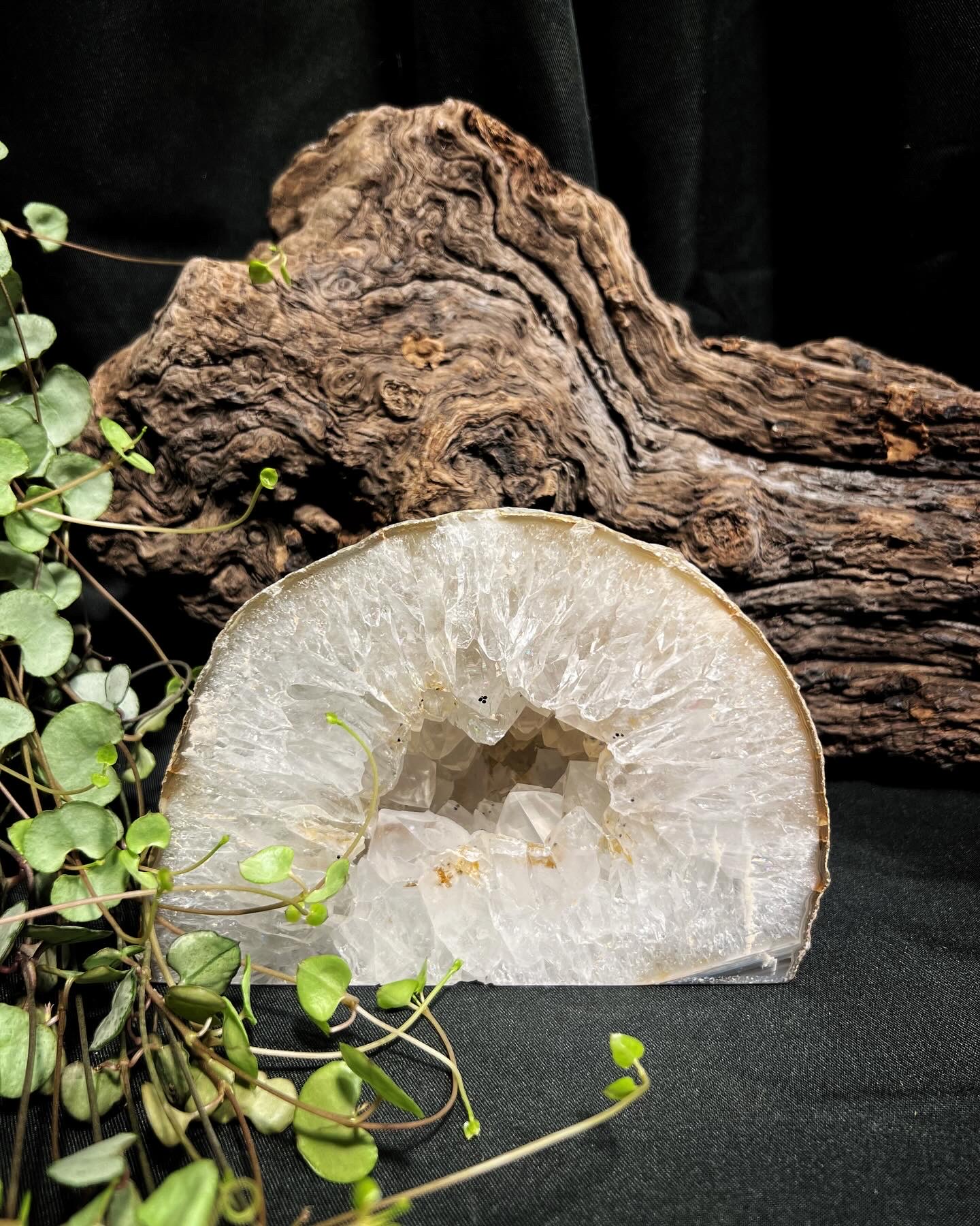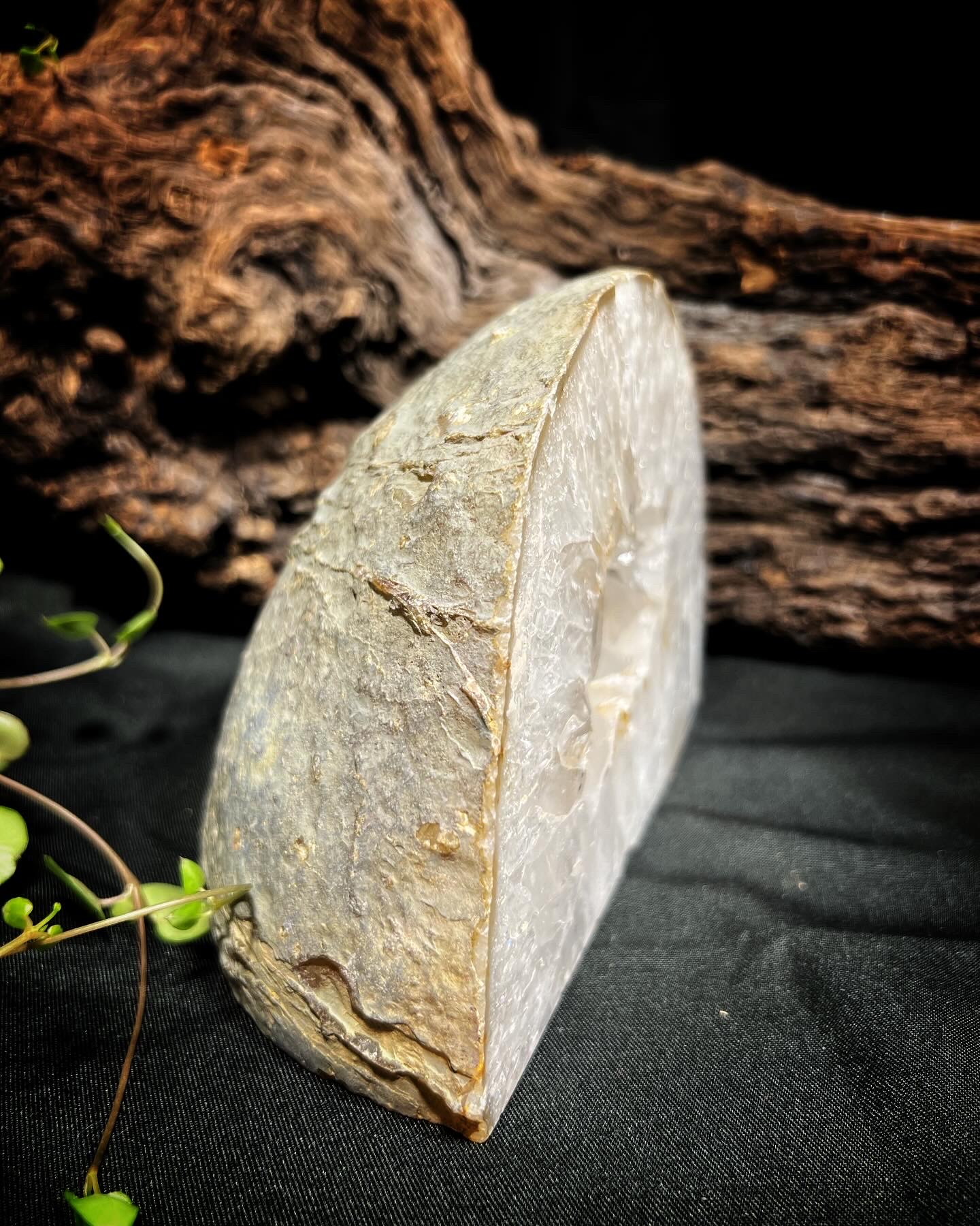 Dit stuk is aan 1 zijde glad gepolijst en heeft mooie witte kristallen. Als je goed kijkt met de juiste lichtinval verschijnen er regenboog kleurtjes.