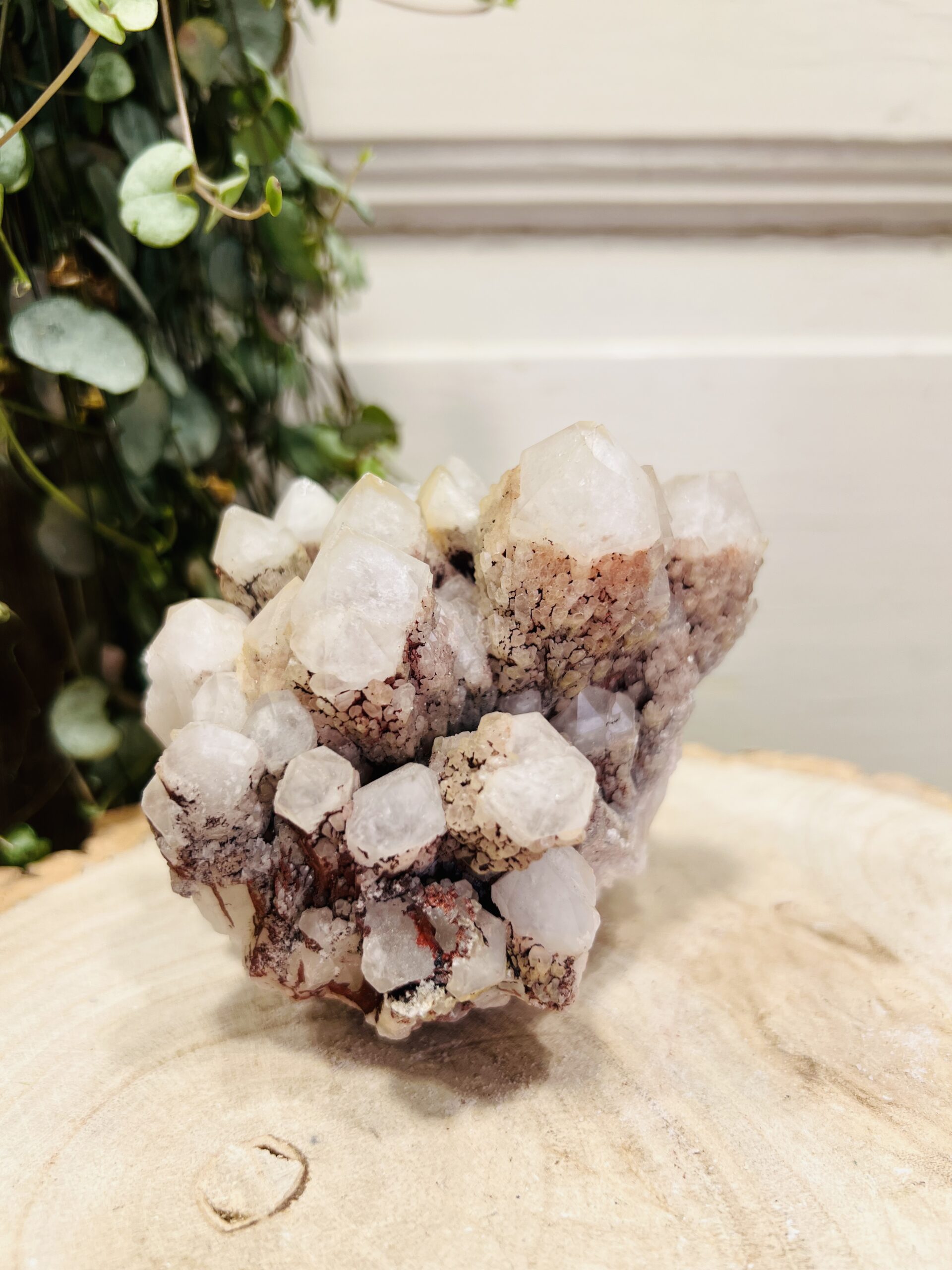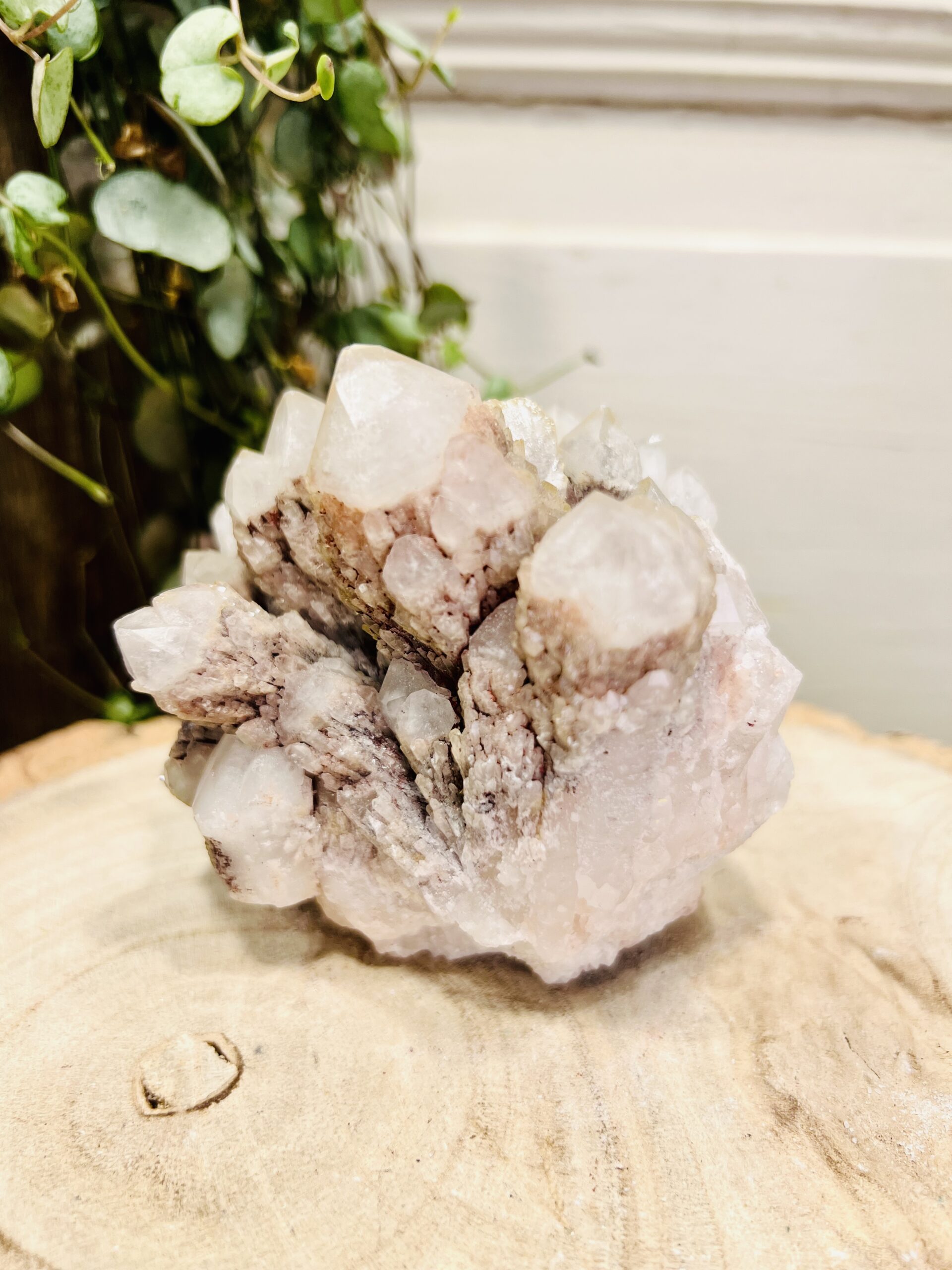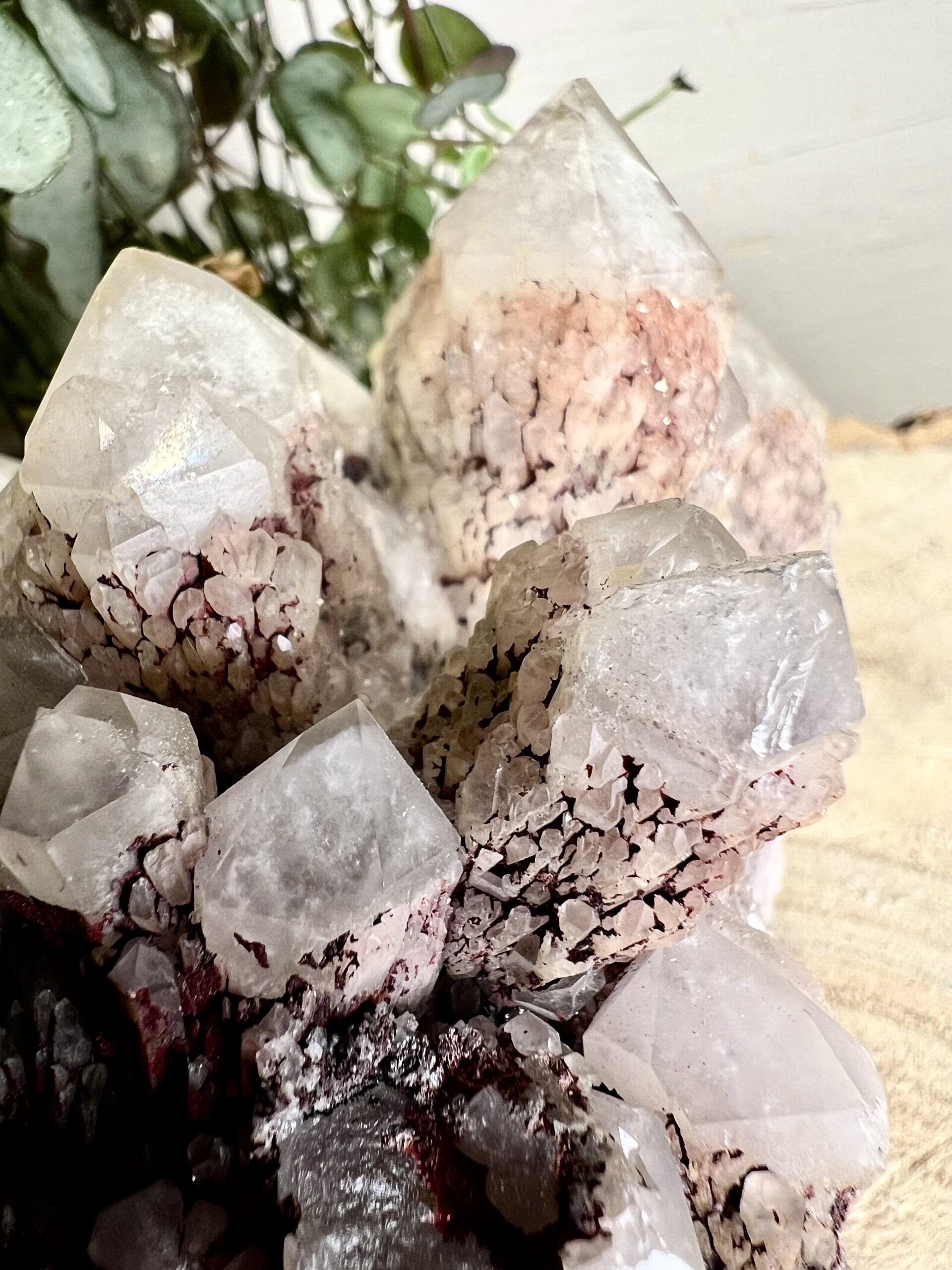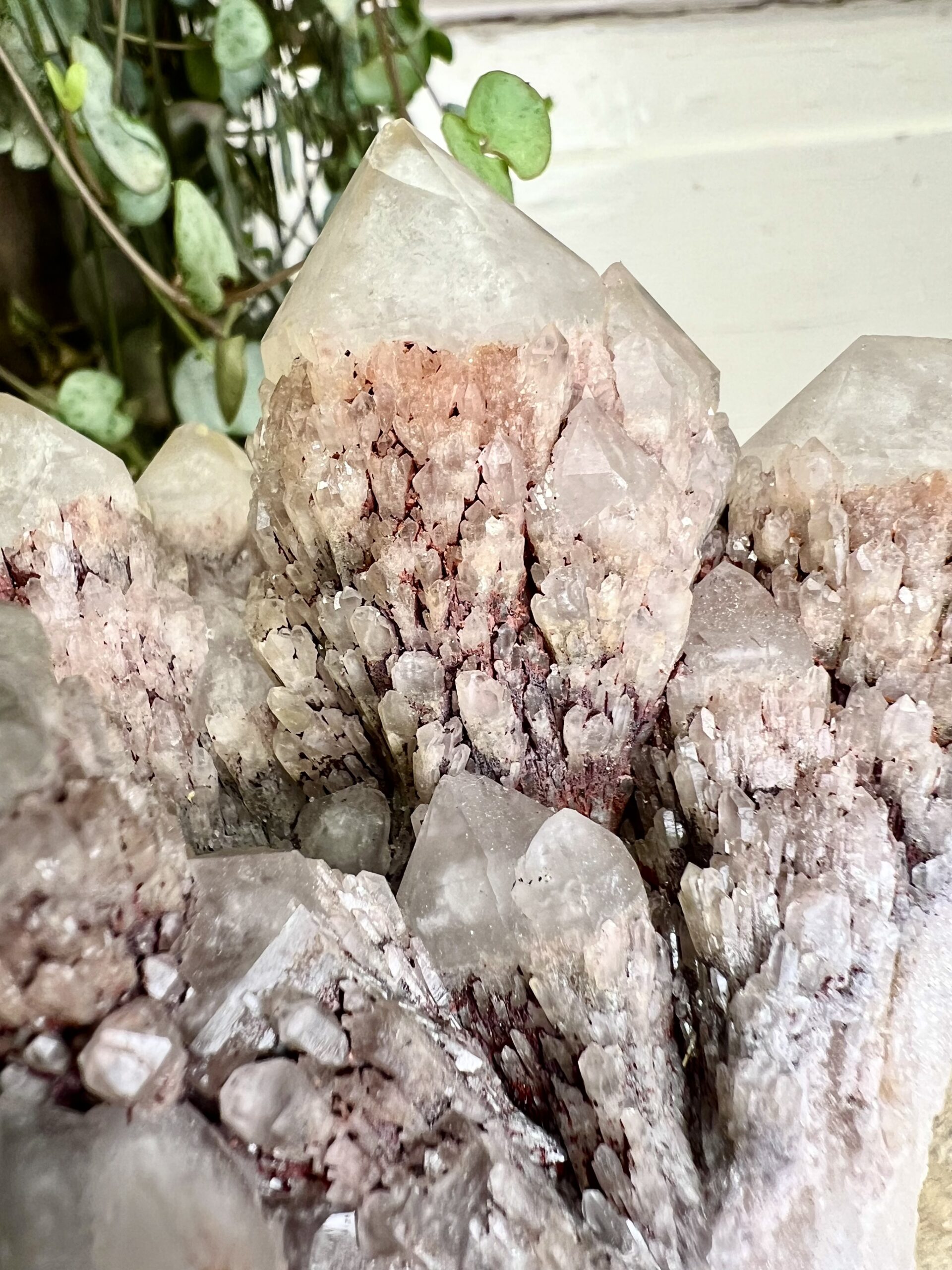 Prachtige Ananaskwarts cluster met naast een zeer licht roze tint, ook mooie diep rode stukken.