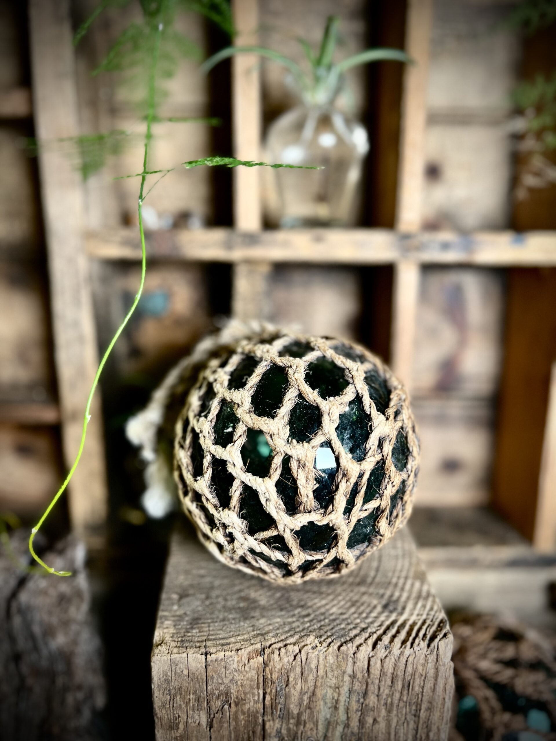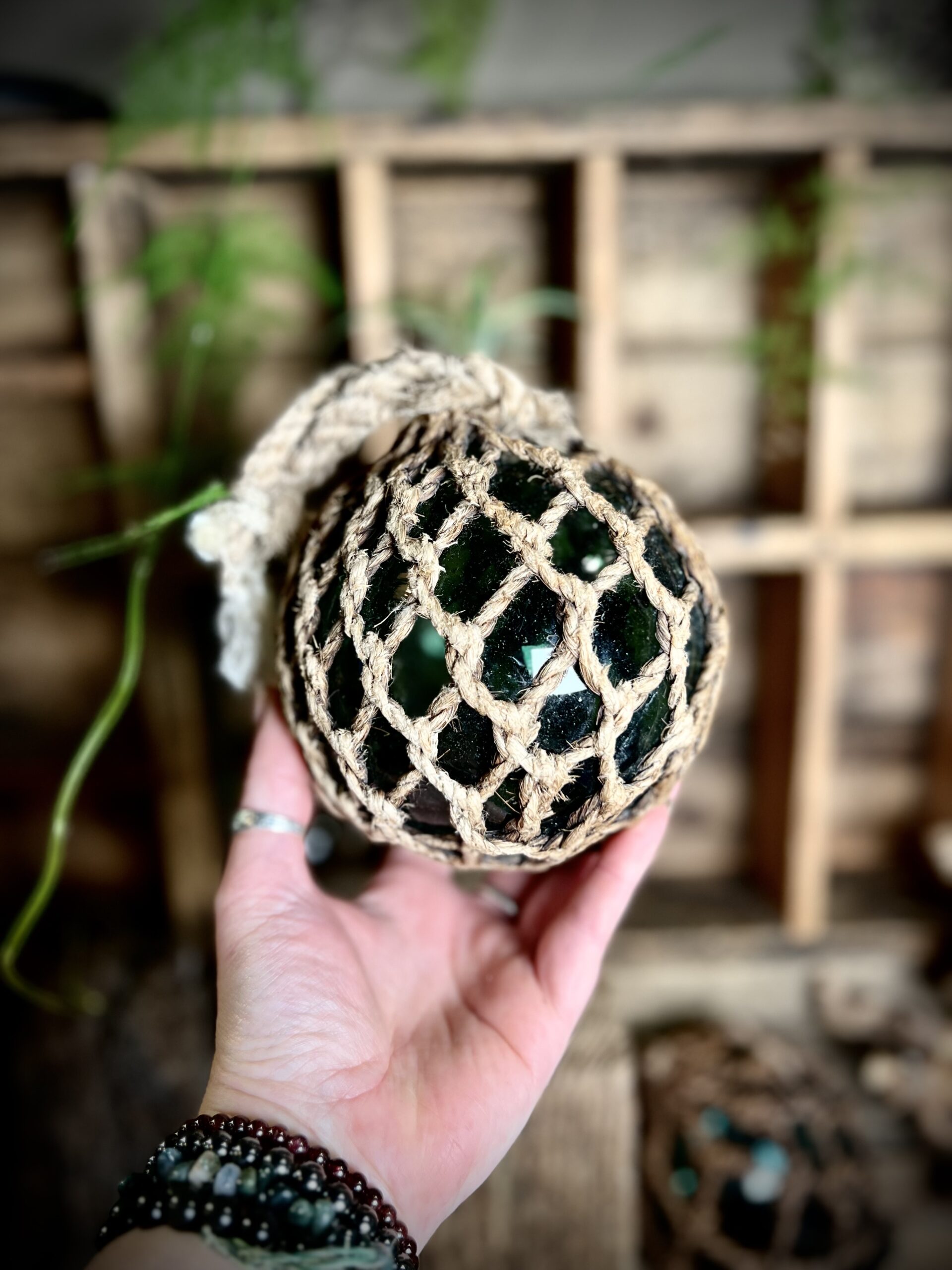 Deze donker groene drijver is van zeer dik mondgeblazen glas en heeft nog het originele macramé net van stoer dik touw welke vroeger werden gebruikt om visnetten drijvend te houden.