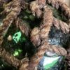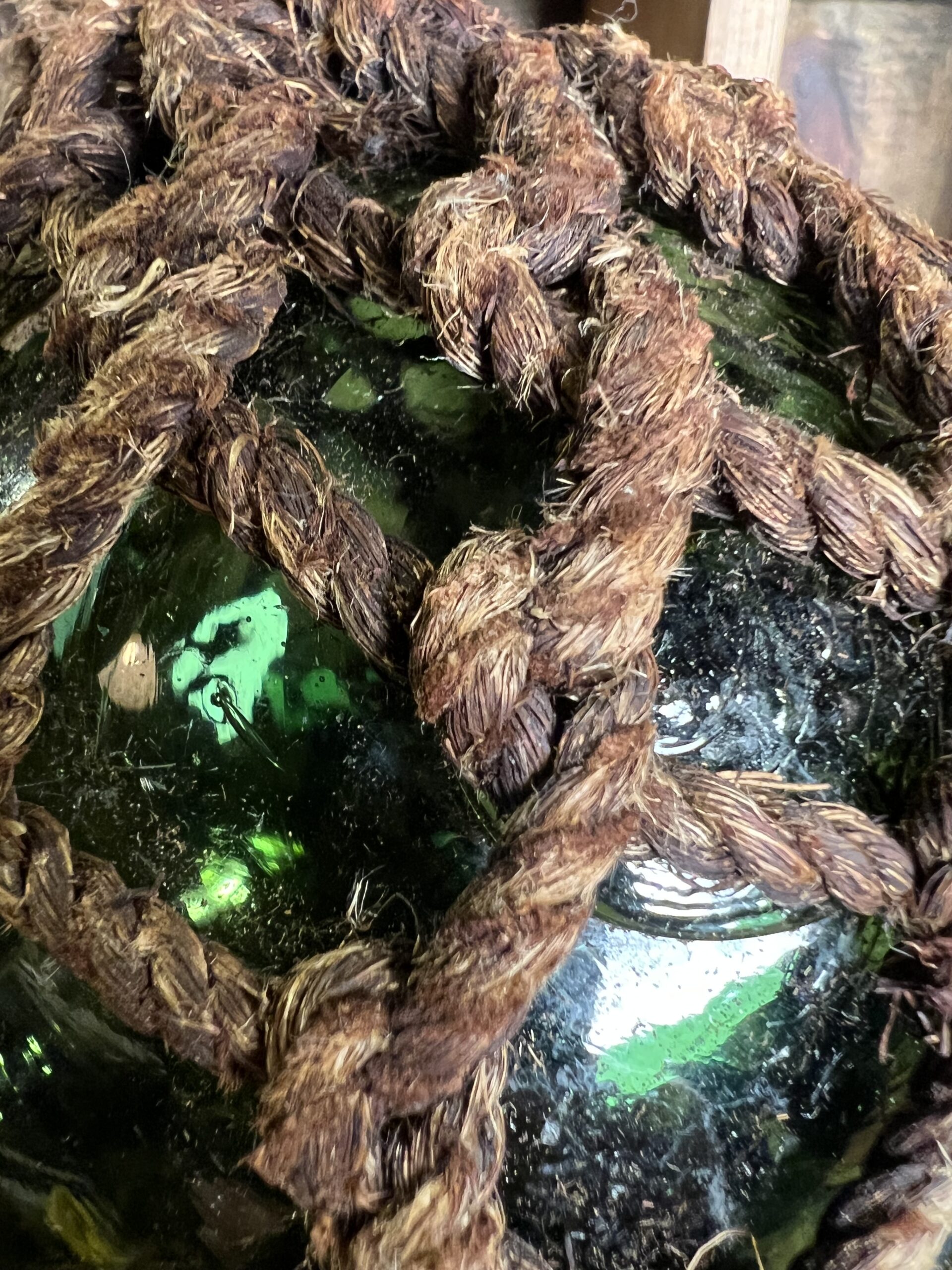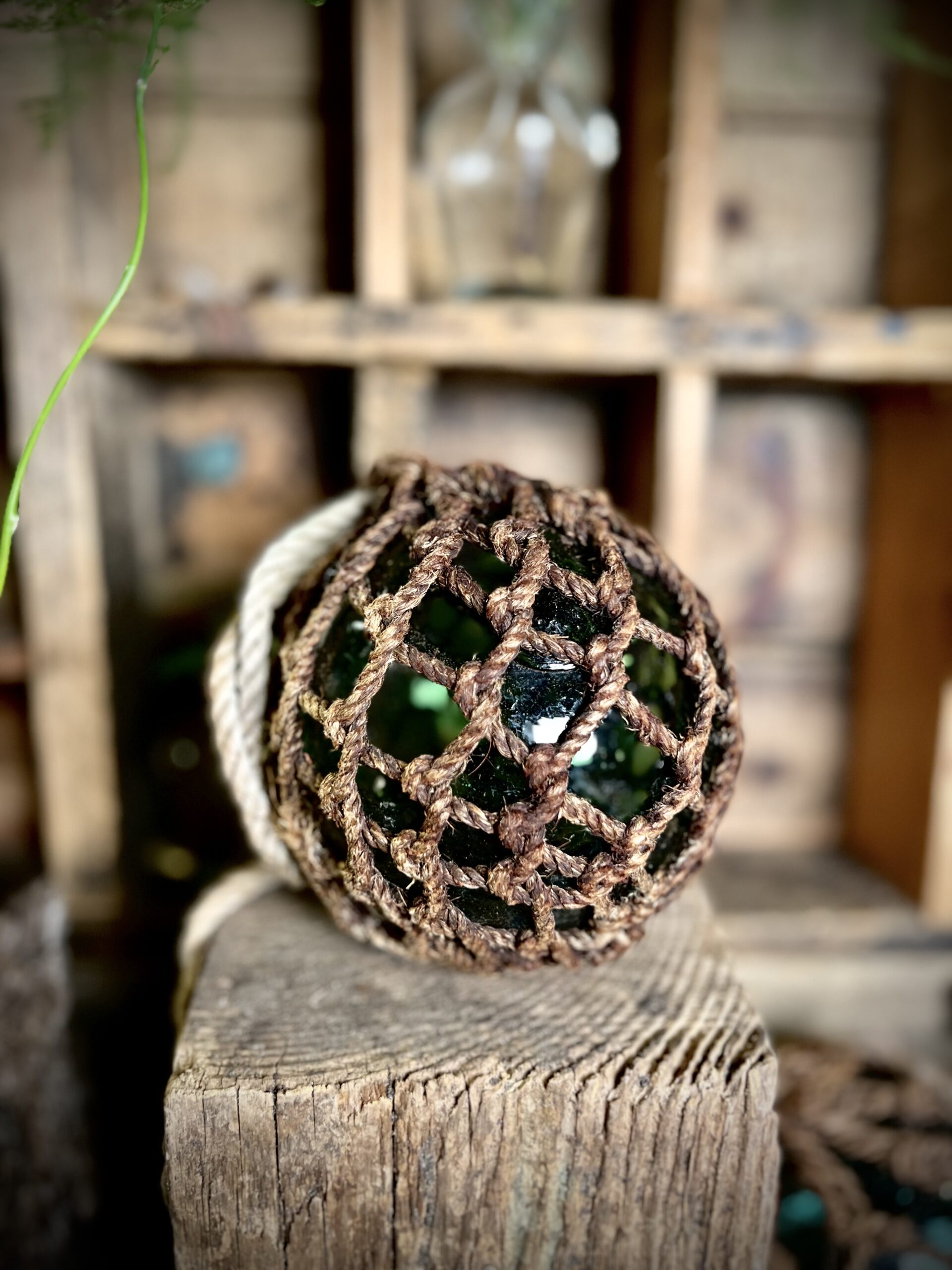 Antieke glazen drijver in macramé net.