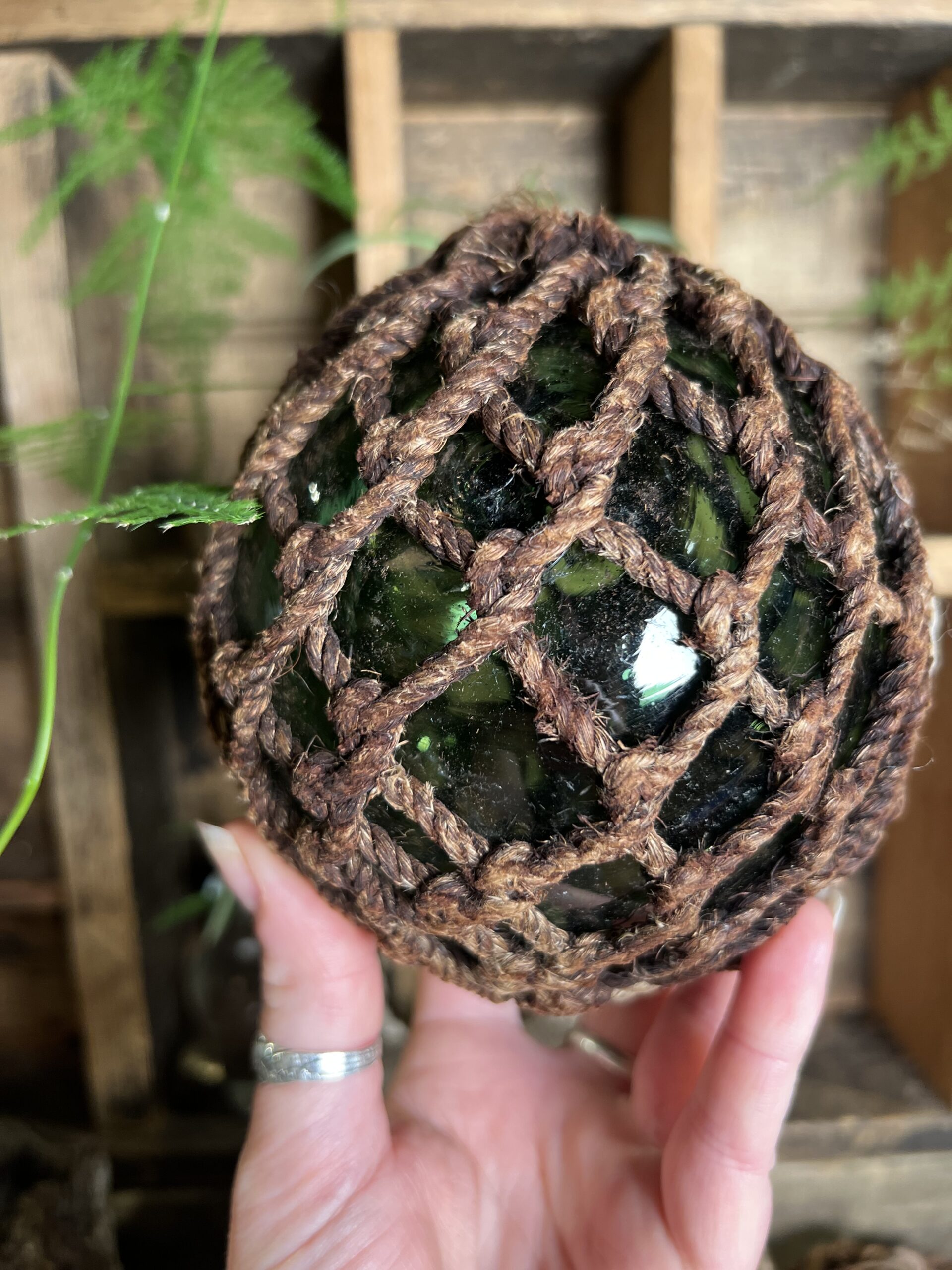 Deze donker groene drijver is van zeer dik mondgeblazen glas en heeft nog het originele macramé net van stoer dik touw welke vroeger werden gebruikt om visnetten drijvend te houden.