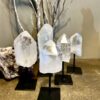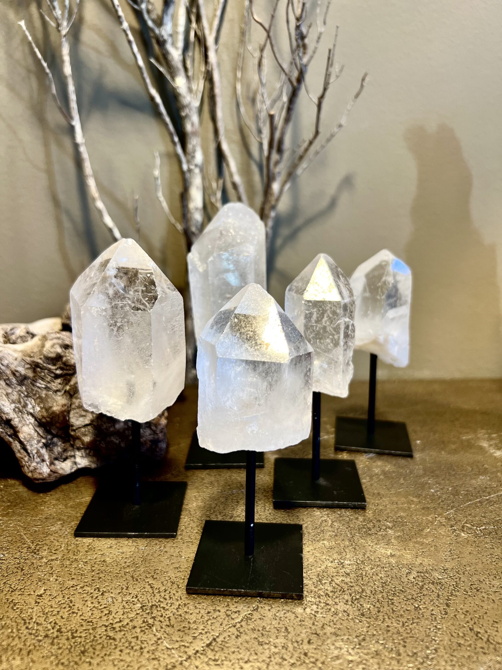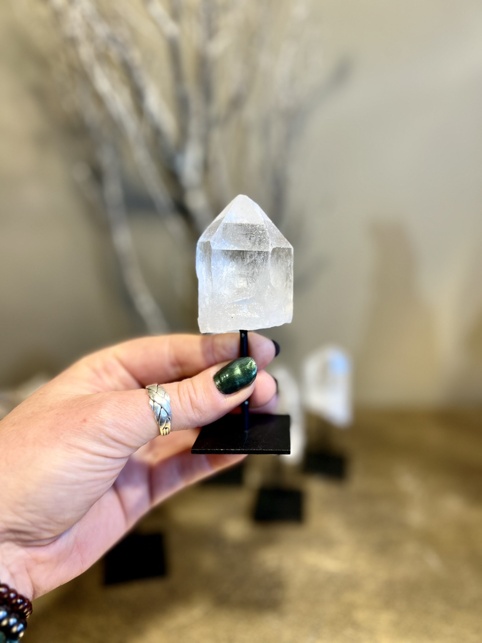 Natuurlijke bergkristal punt op een zwarte stalen voet.
