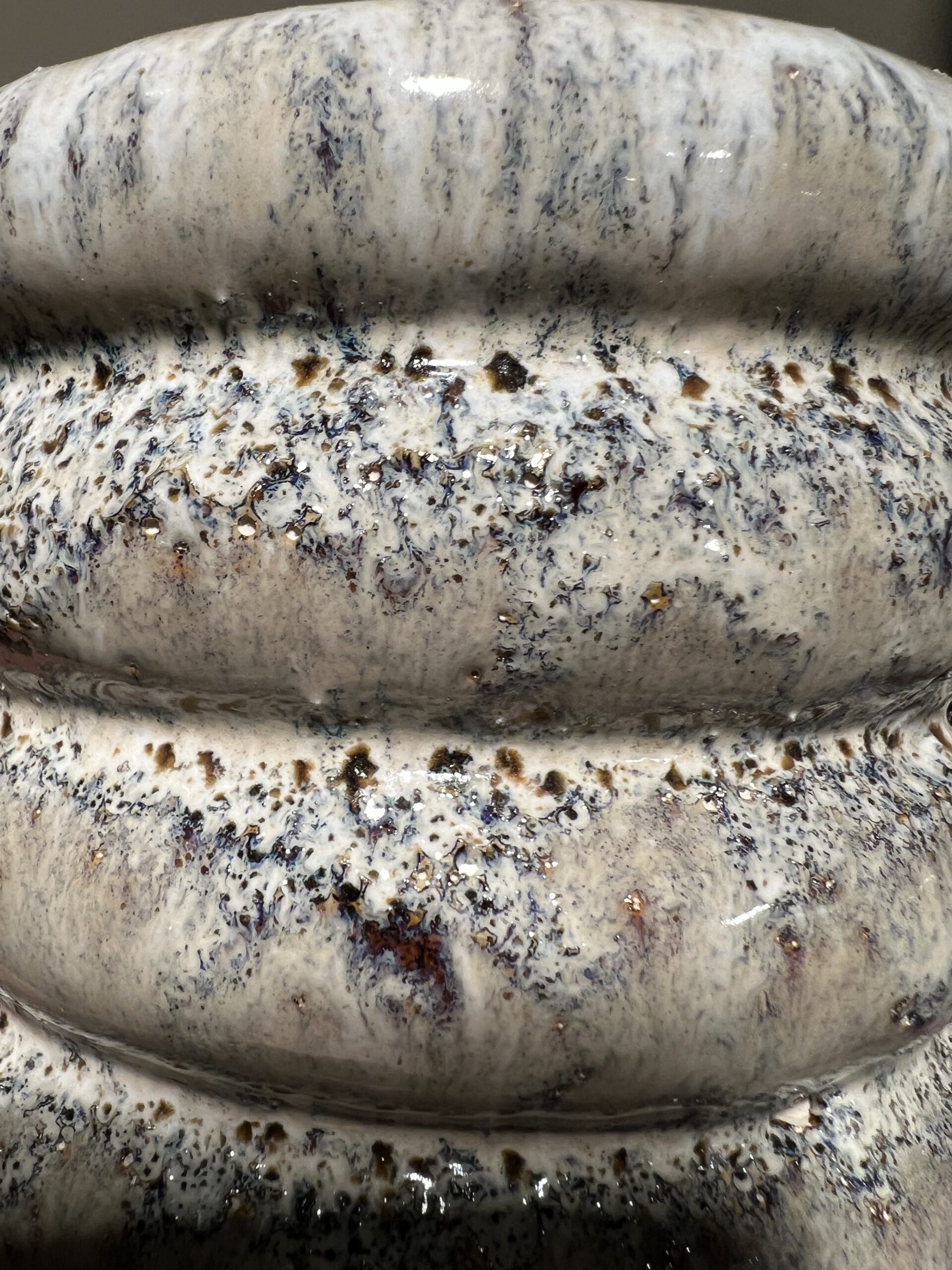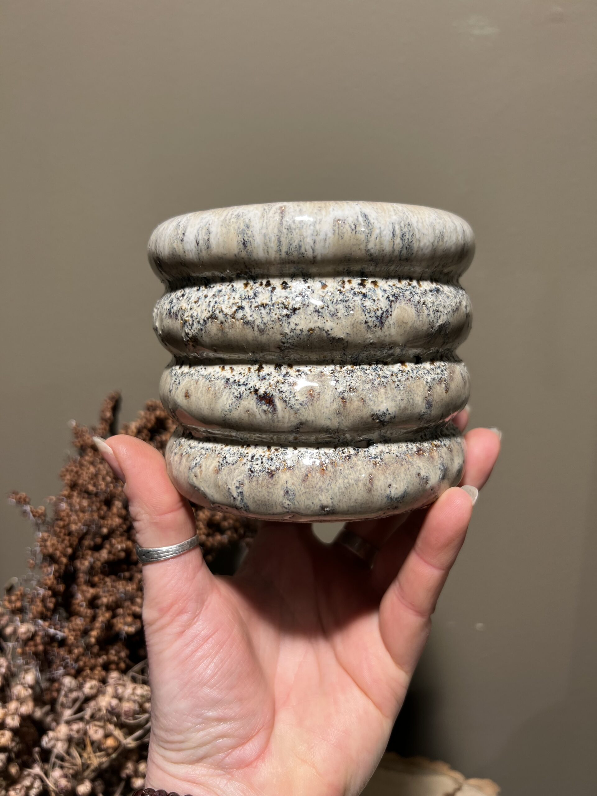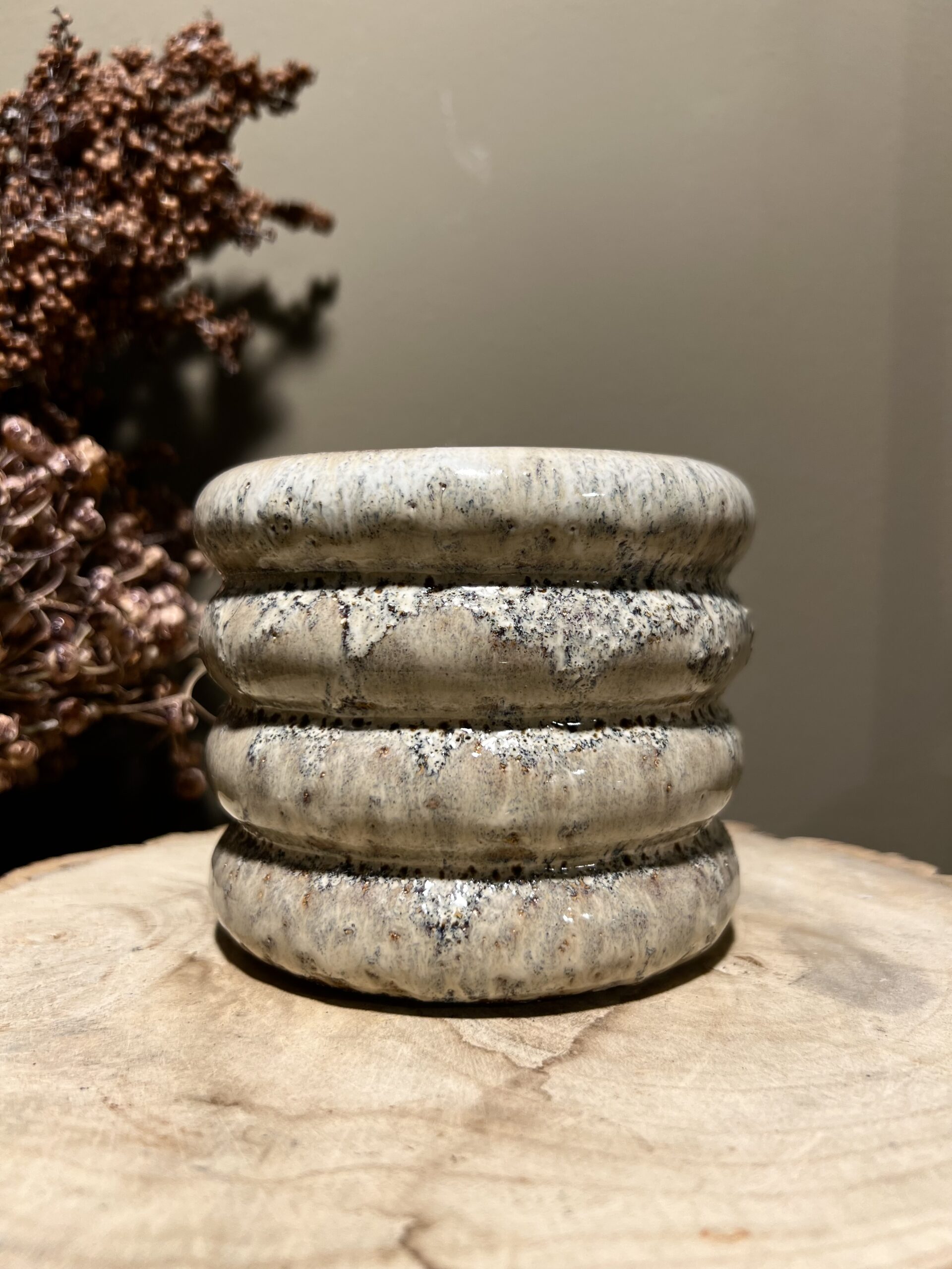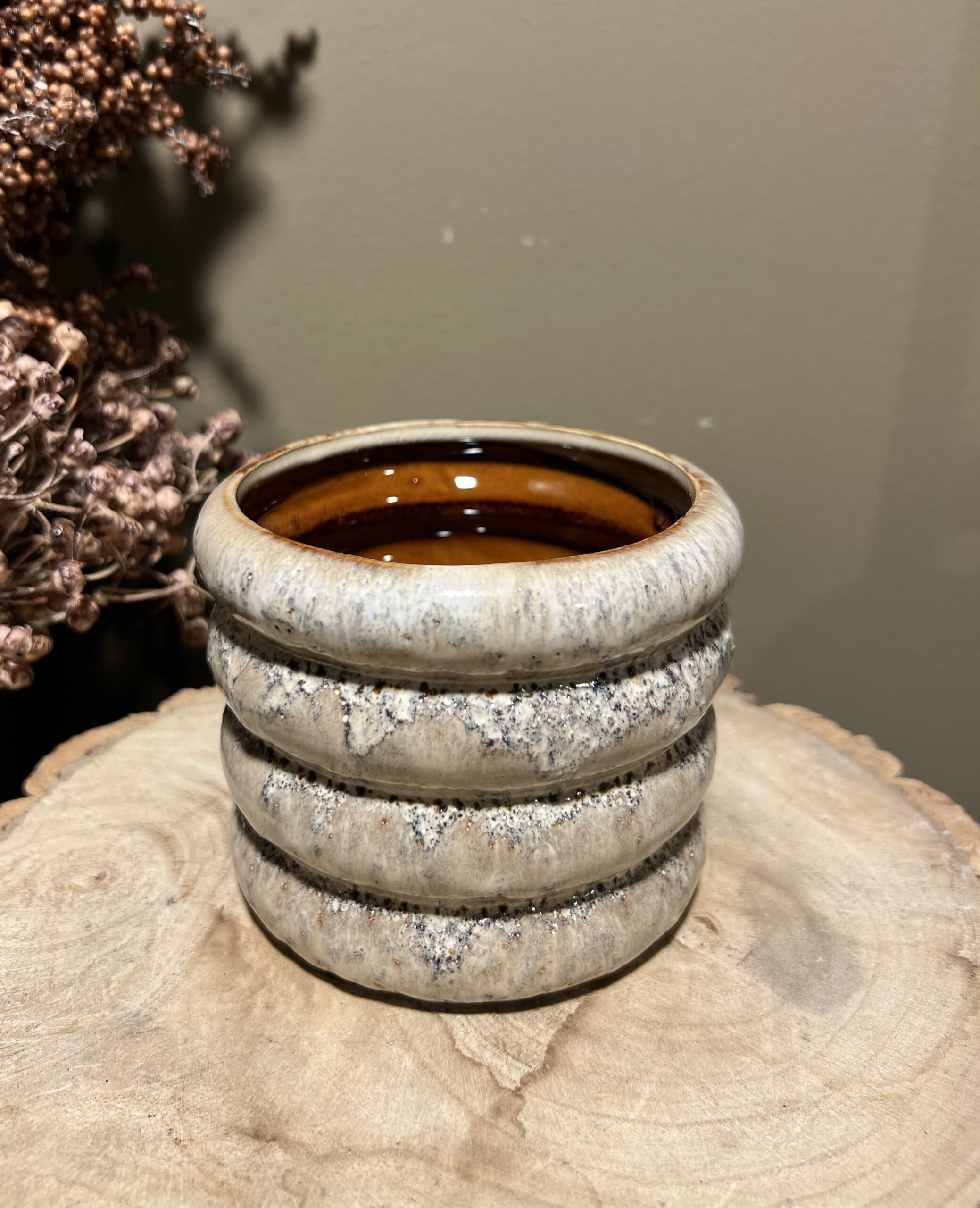Deze bloempot is van hoogwaardig keramiek, de afwerking ruw en koraalachtig, waardoor hij een bijzondere uitstraling heeft. De binnenzijde is geglazuurd en is bruin van kleur.