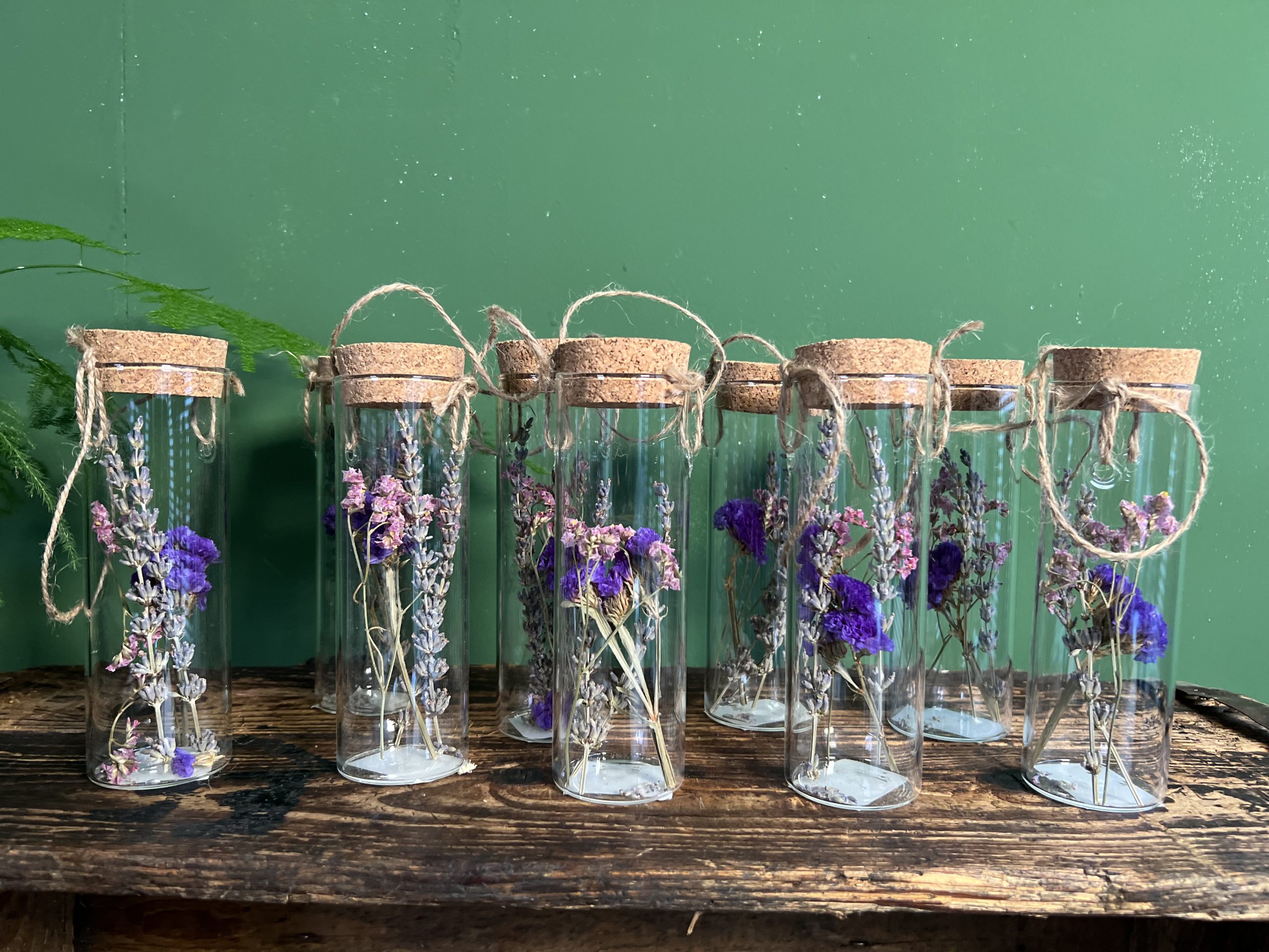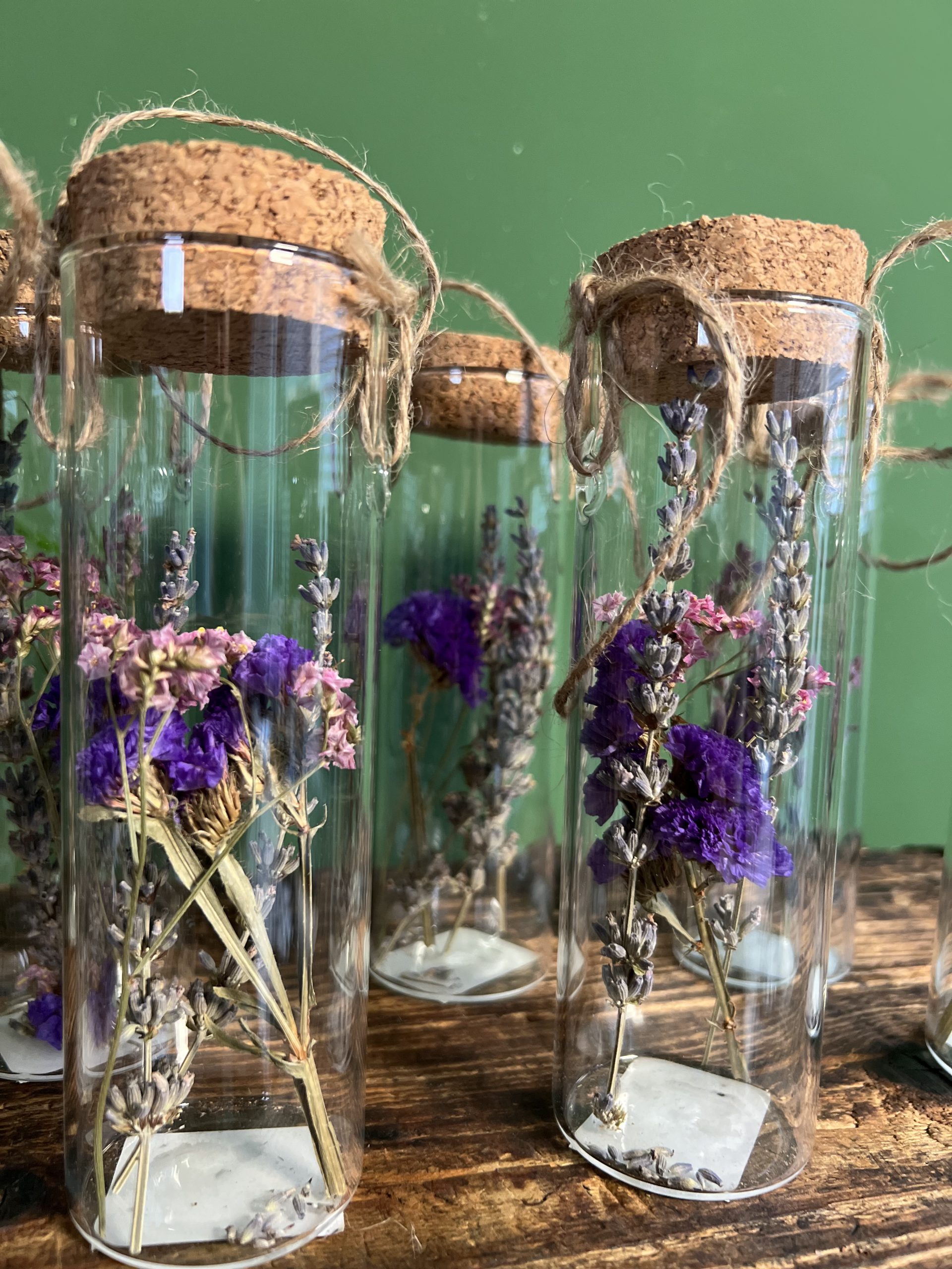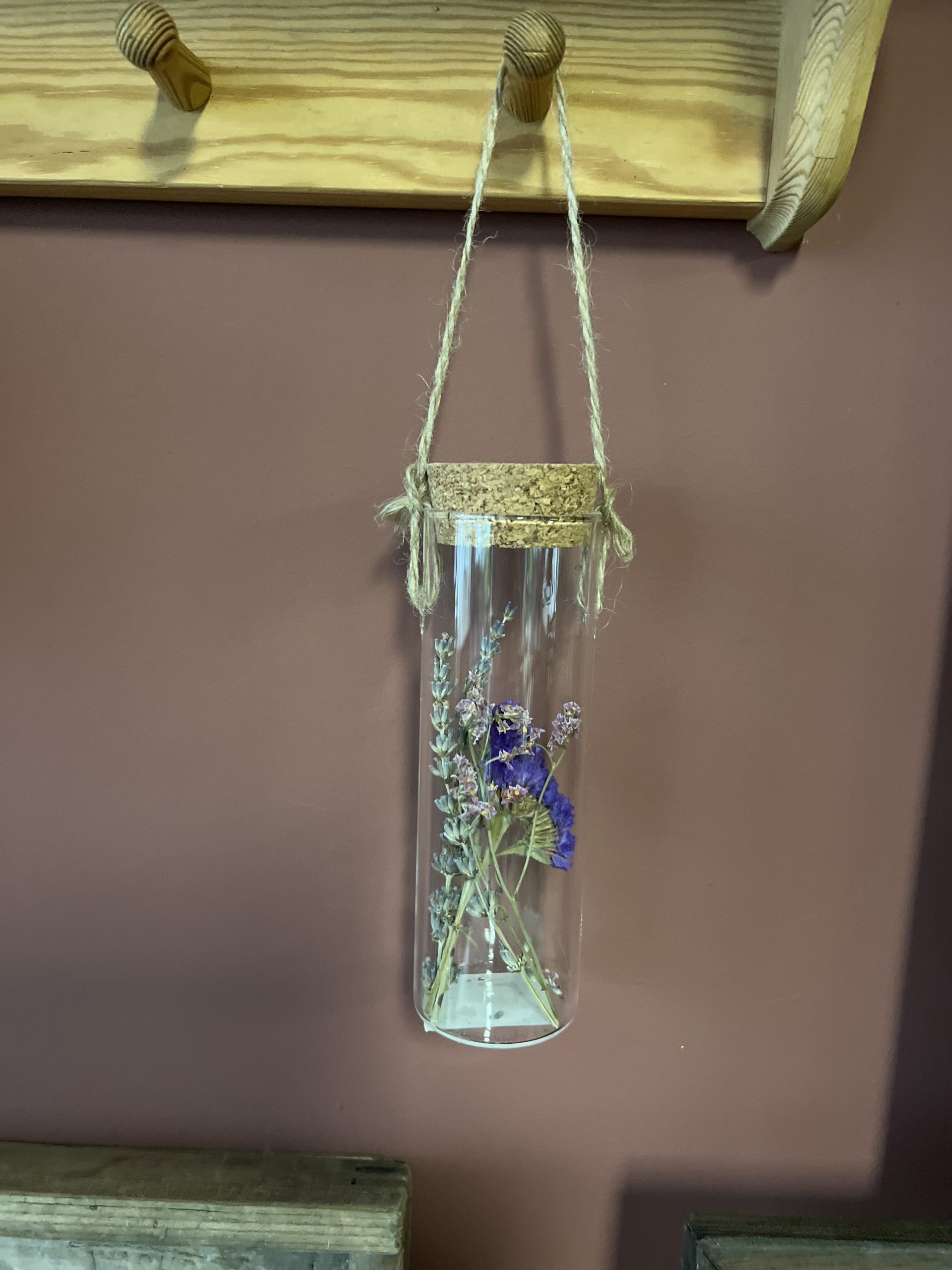 Leuke glazen buisjes (nieuw) met droogbloemen. Kan zowel hangen als staan.
