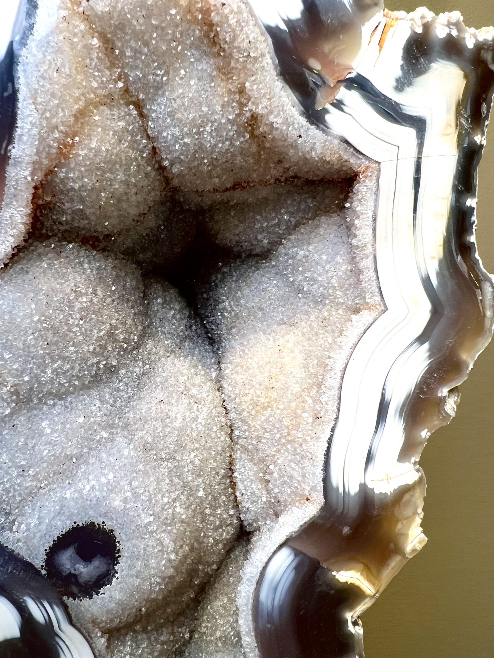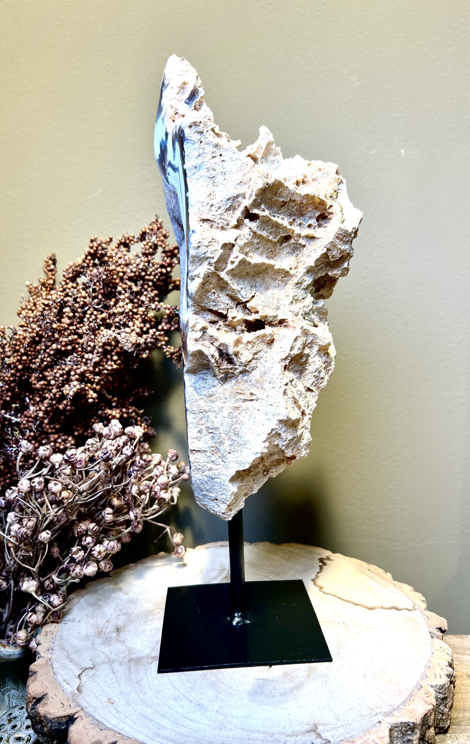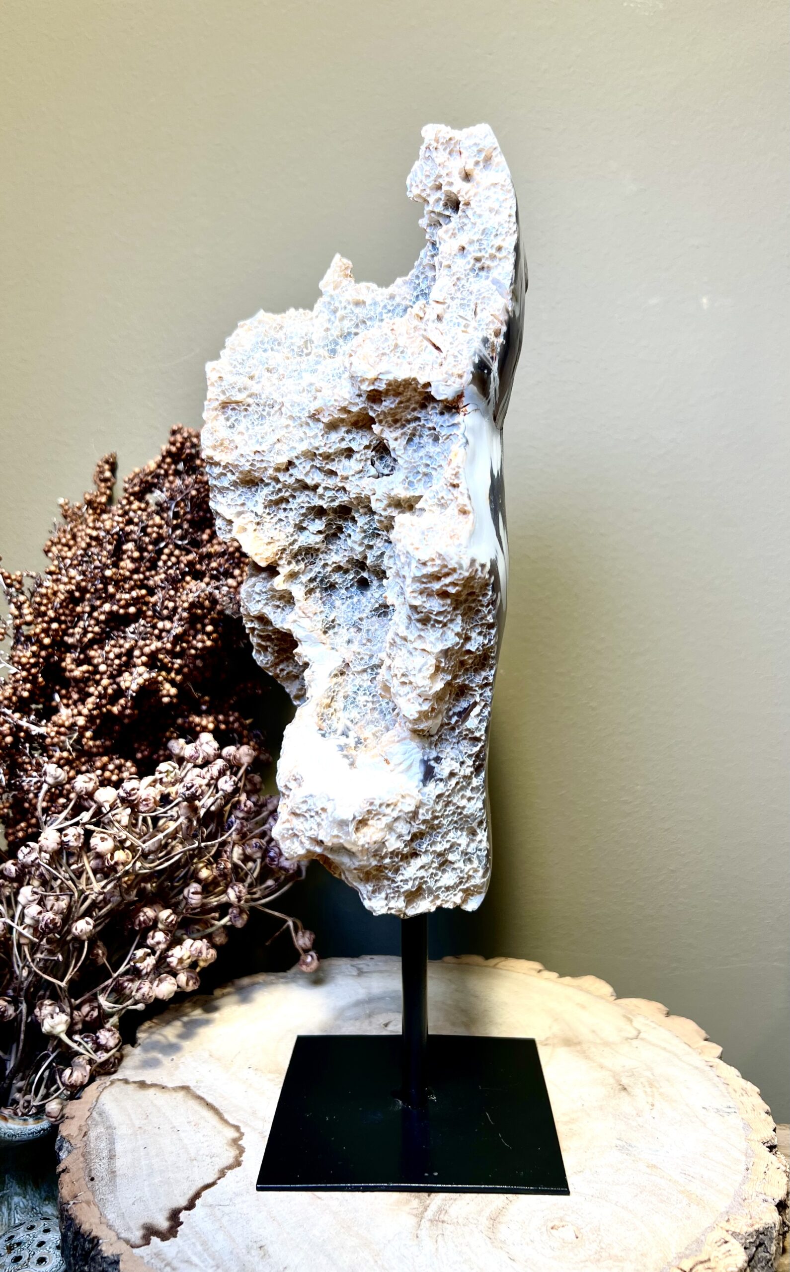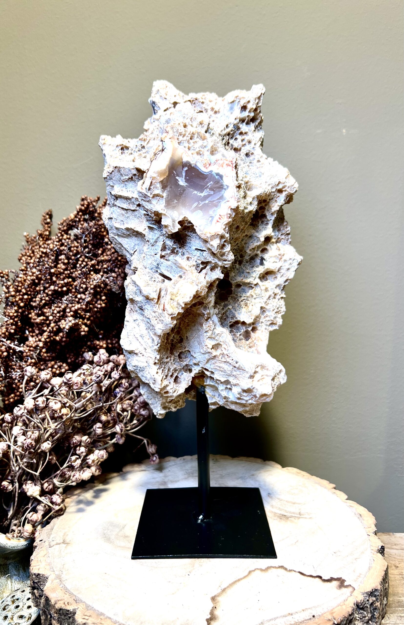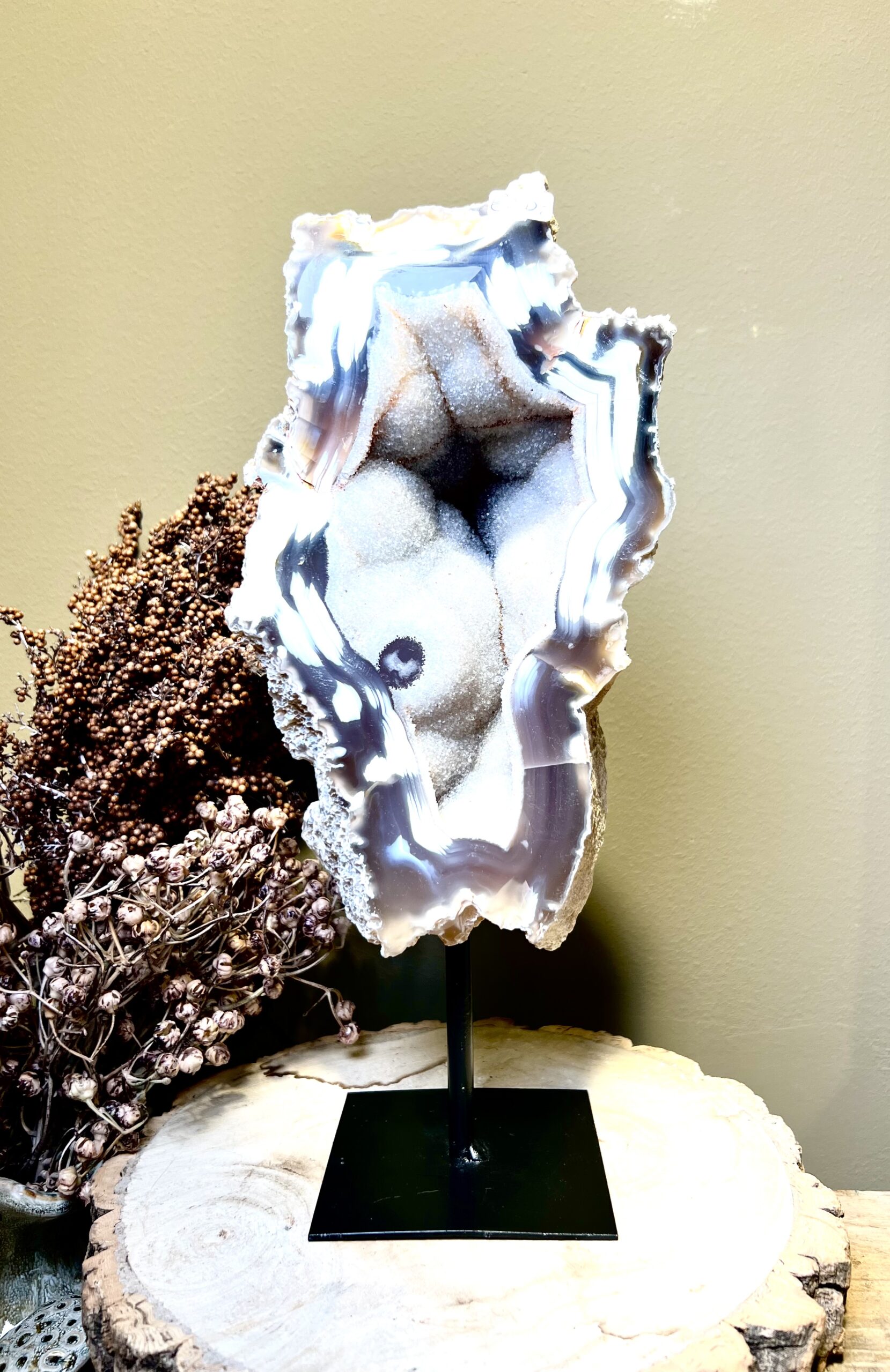 Prachtige rots agaat op een zwarte stalen voet.