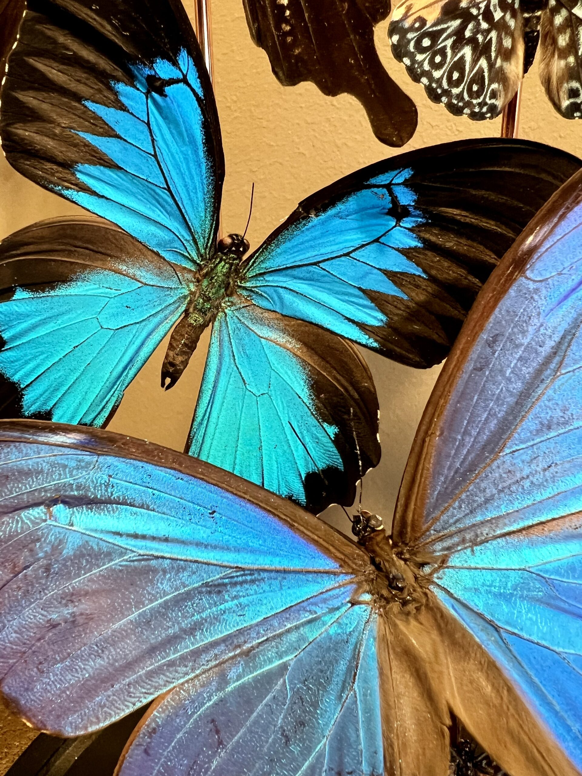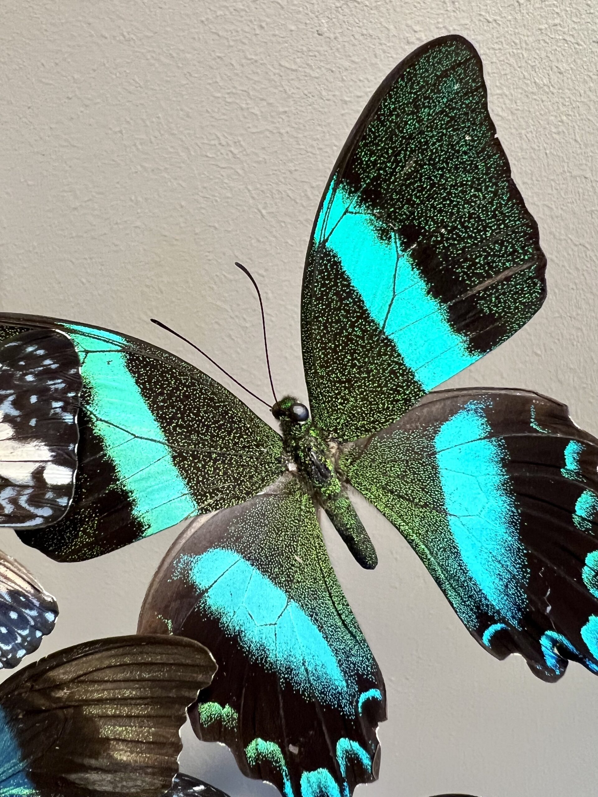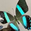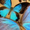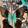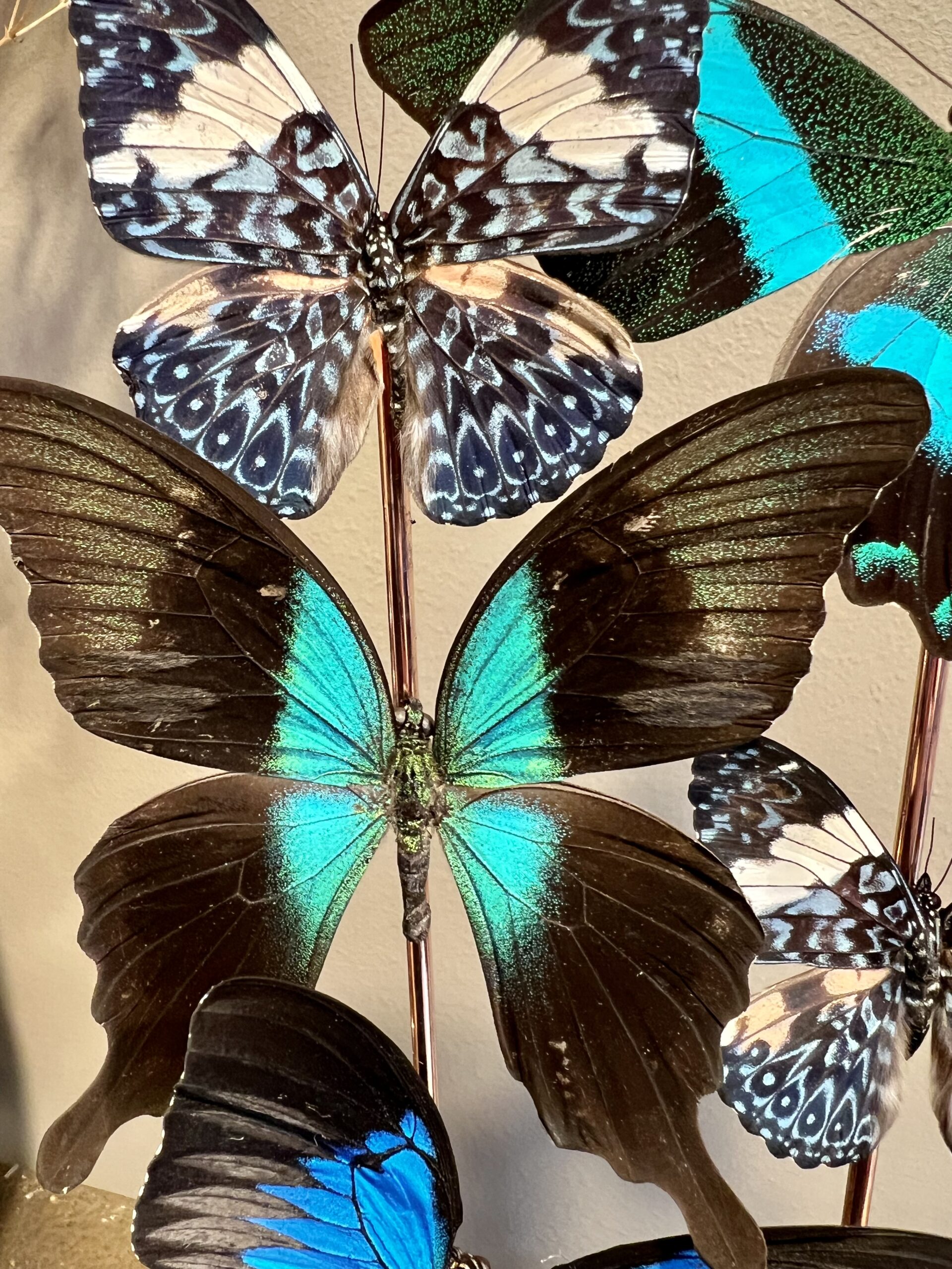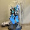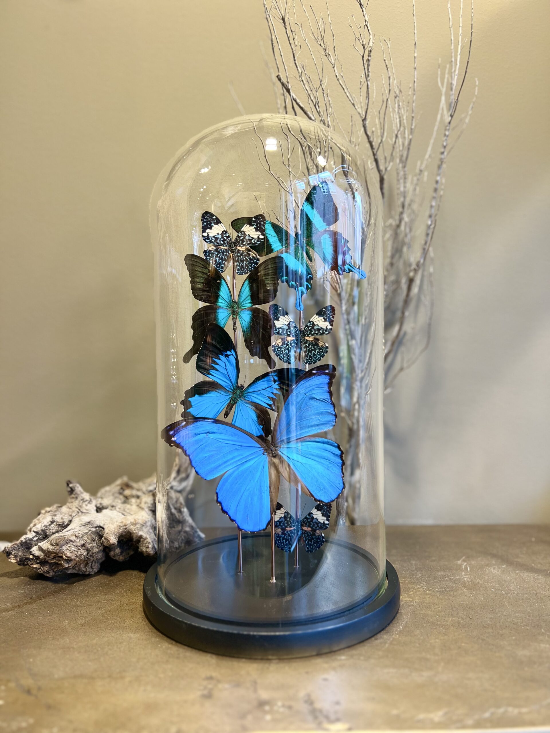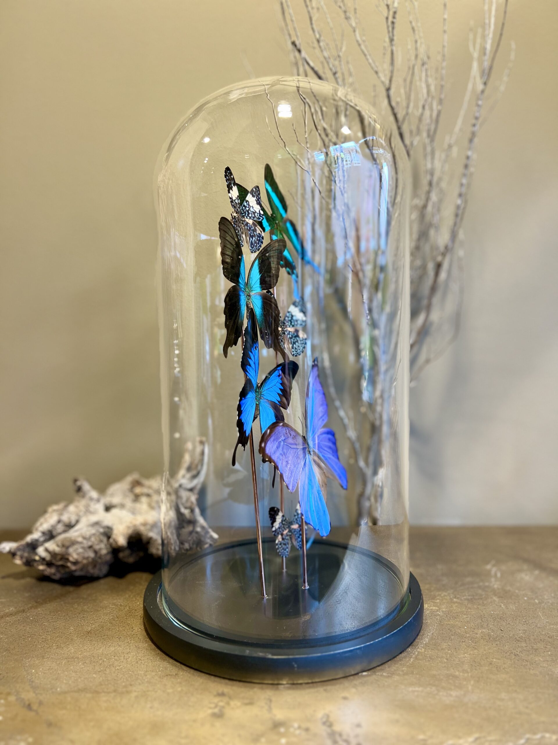 Deze stolp is gevuld met 7 vlinders (5 verschillende soorten) in blauw en groen tinten, waaronder de blauwe morpho en papillio blumei.