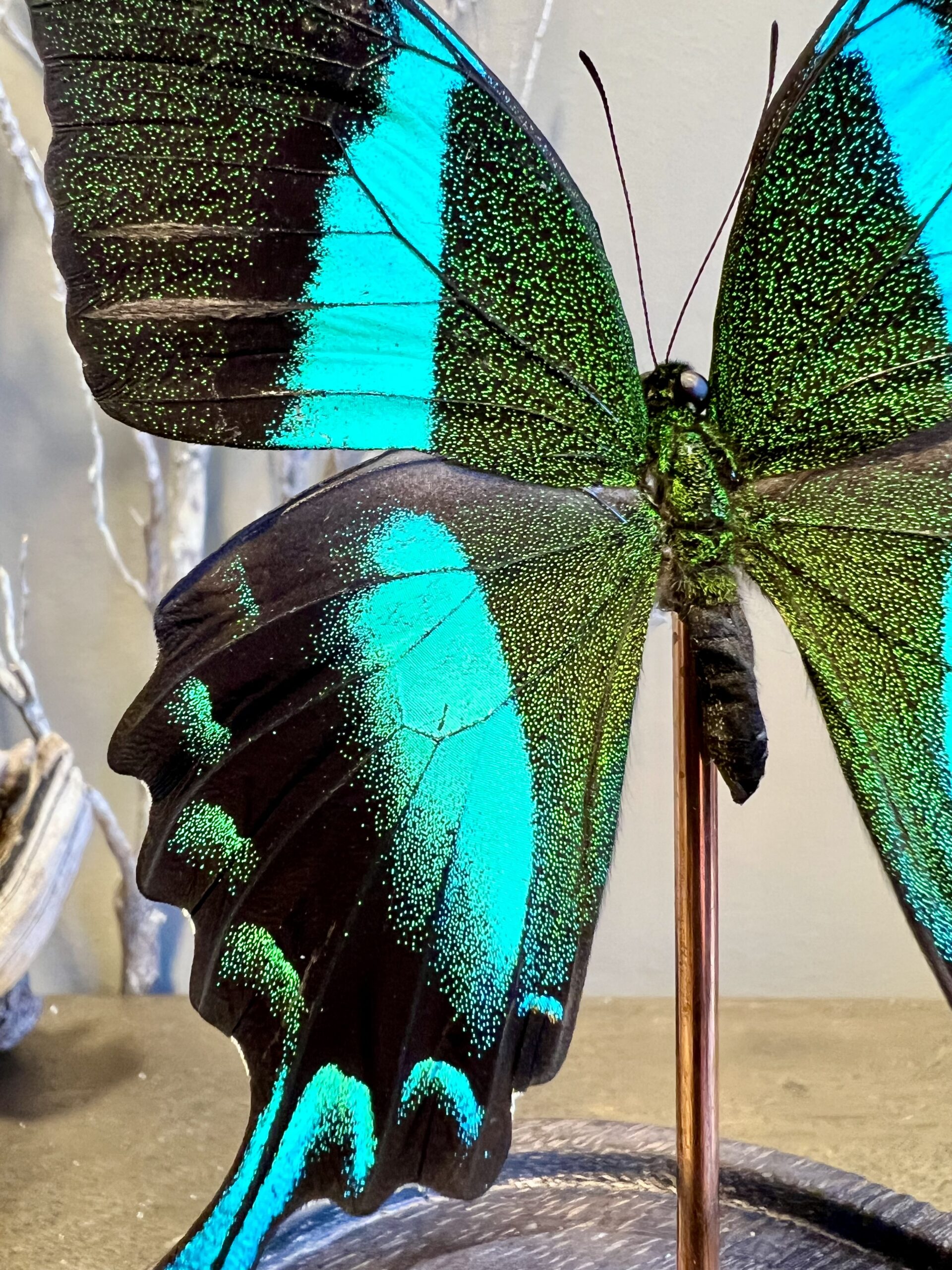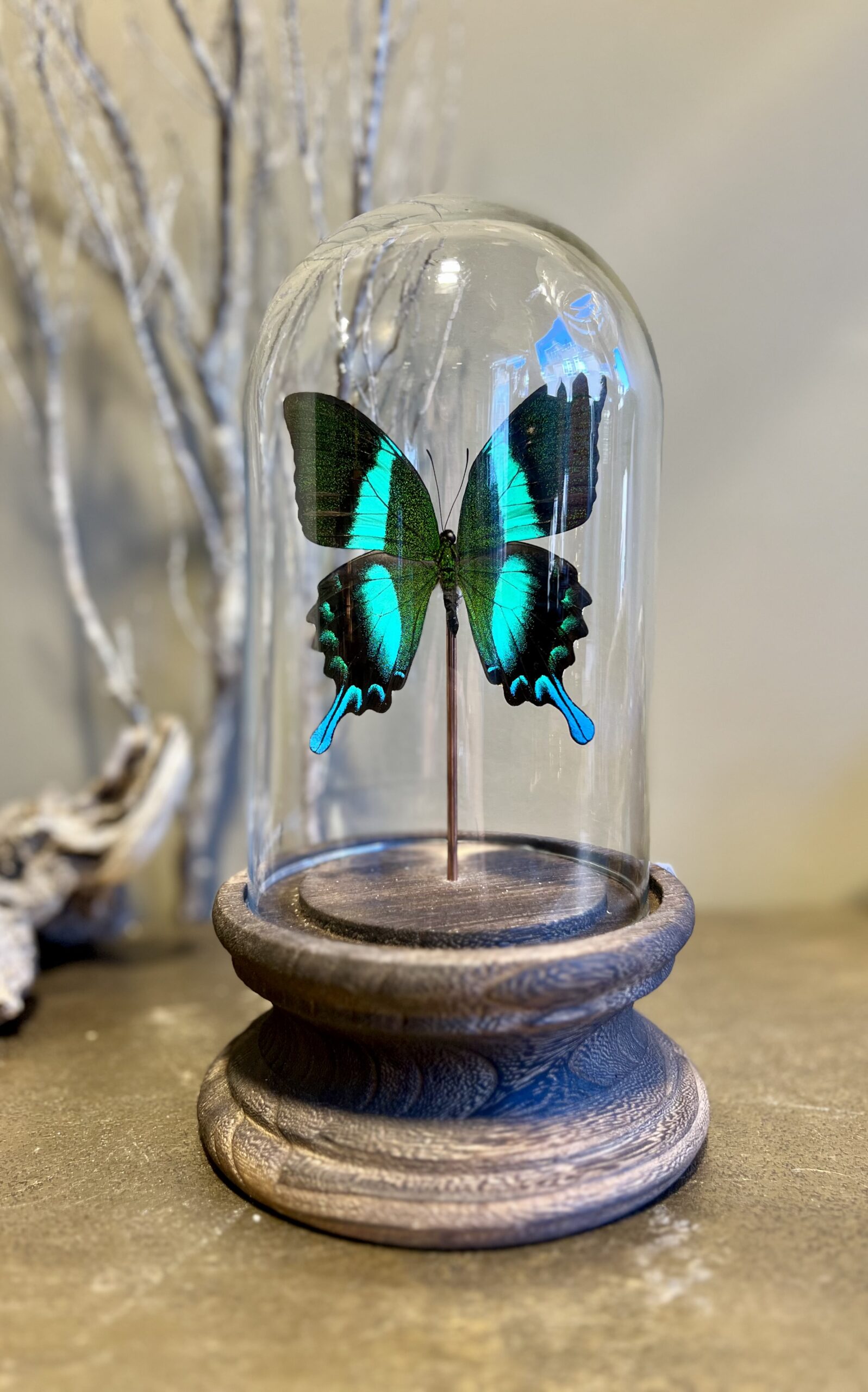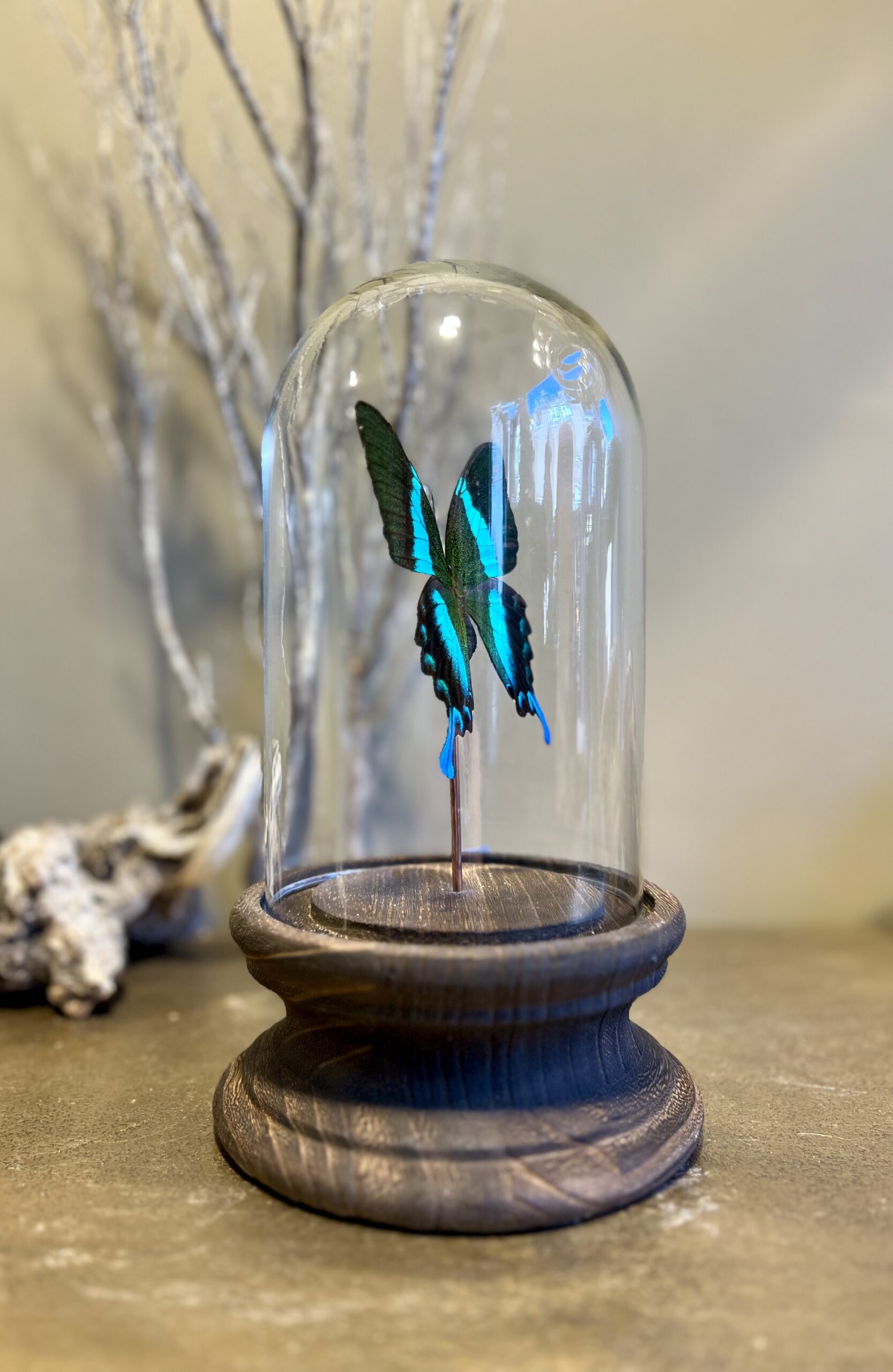 In deze stolp een mooie blauw/ groene Papilio Blumei.