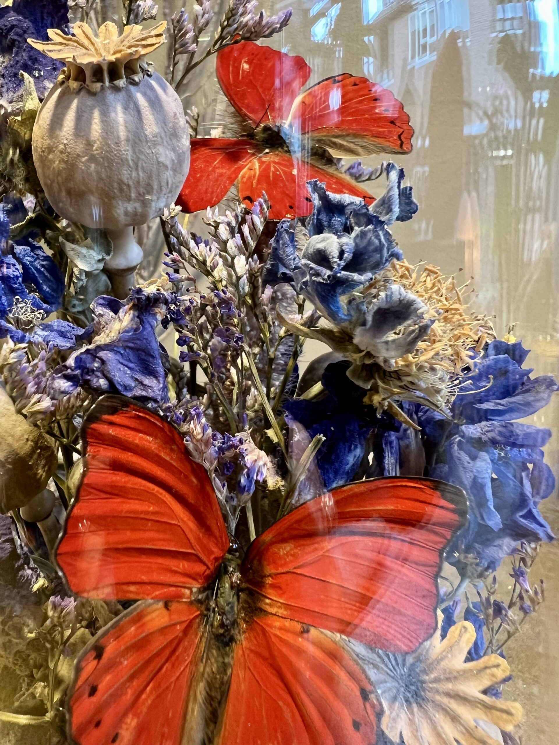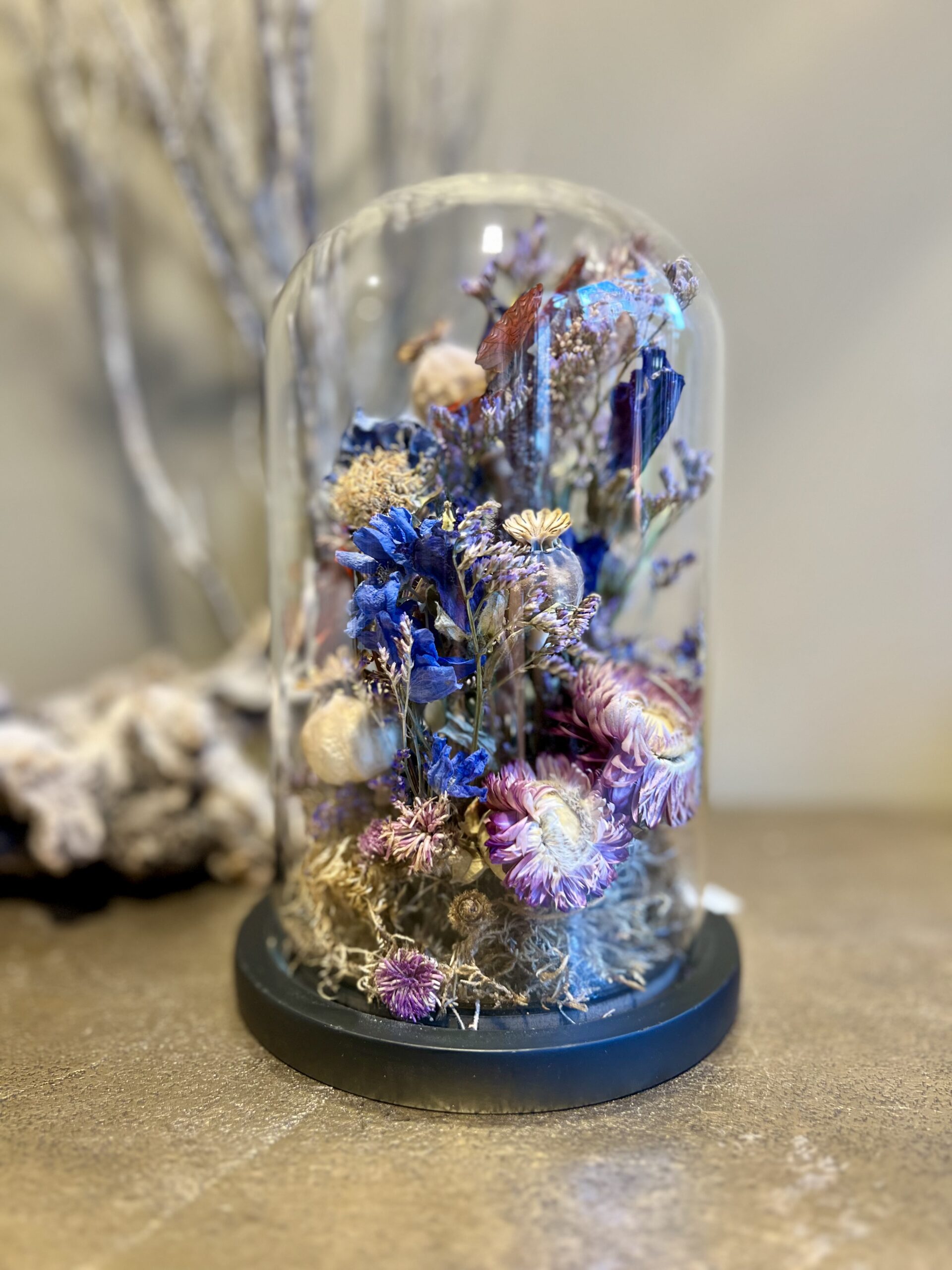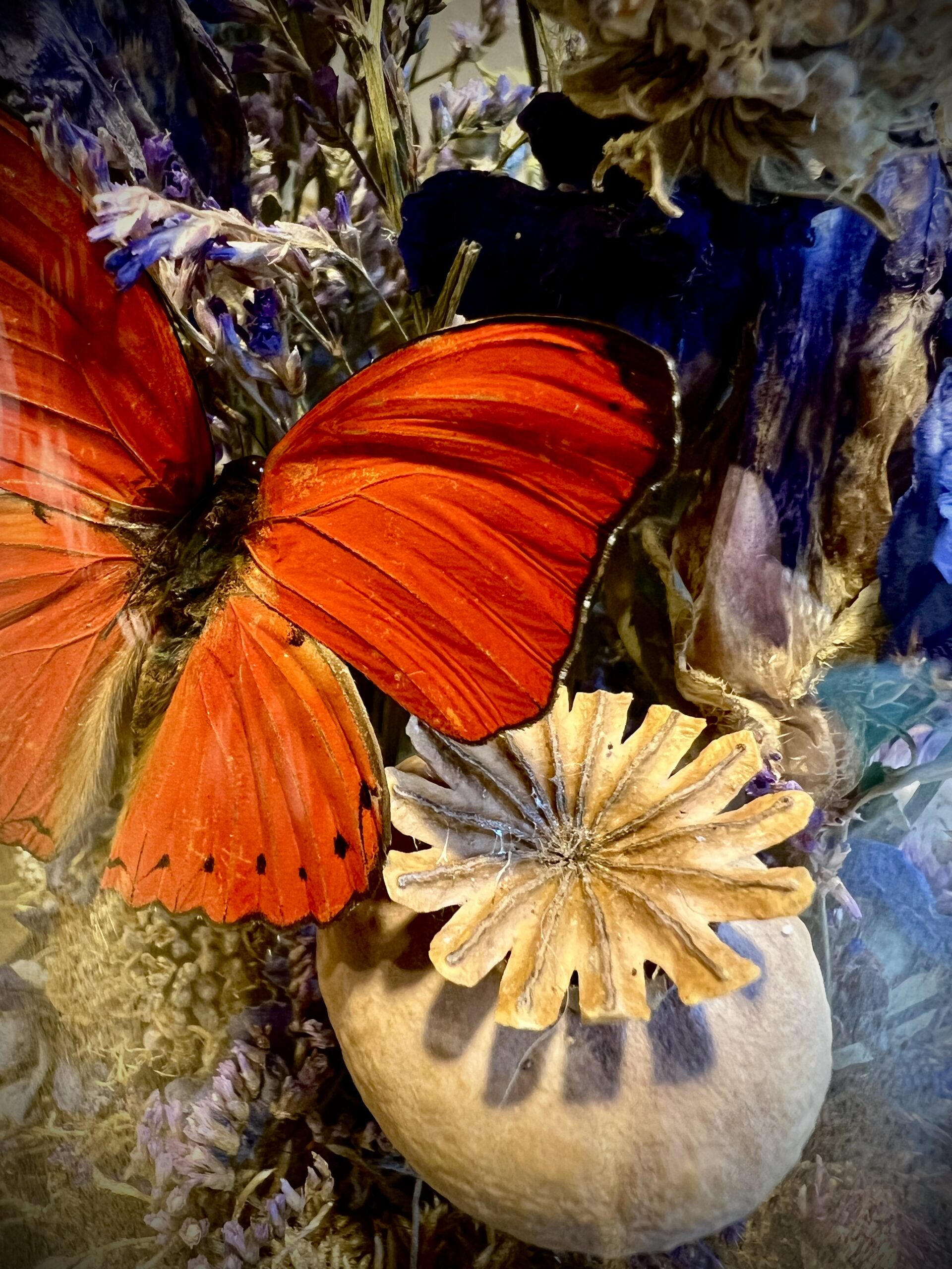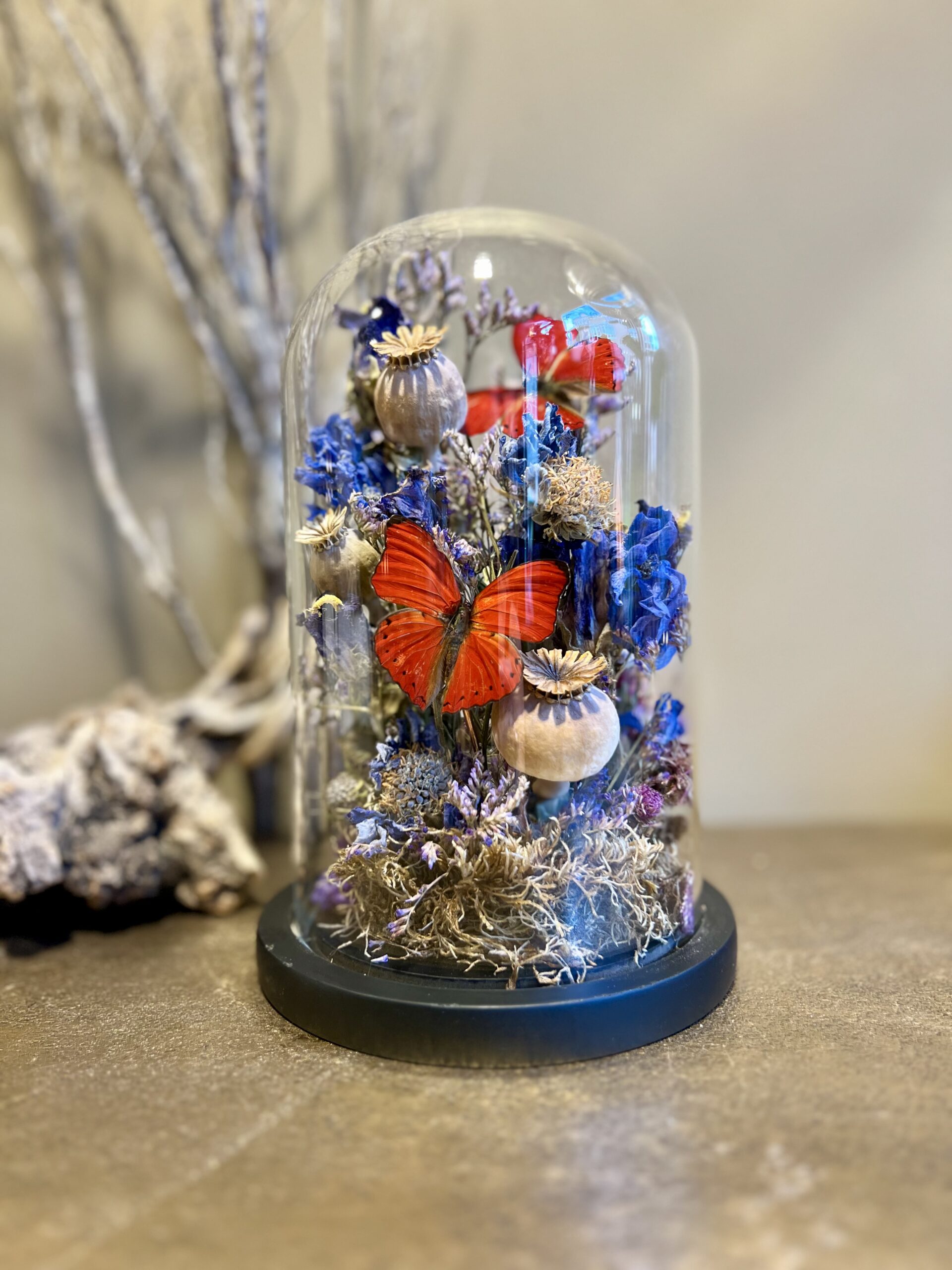 Glazen stolp met vlinders en droogbloemen