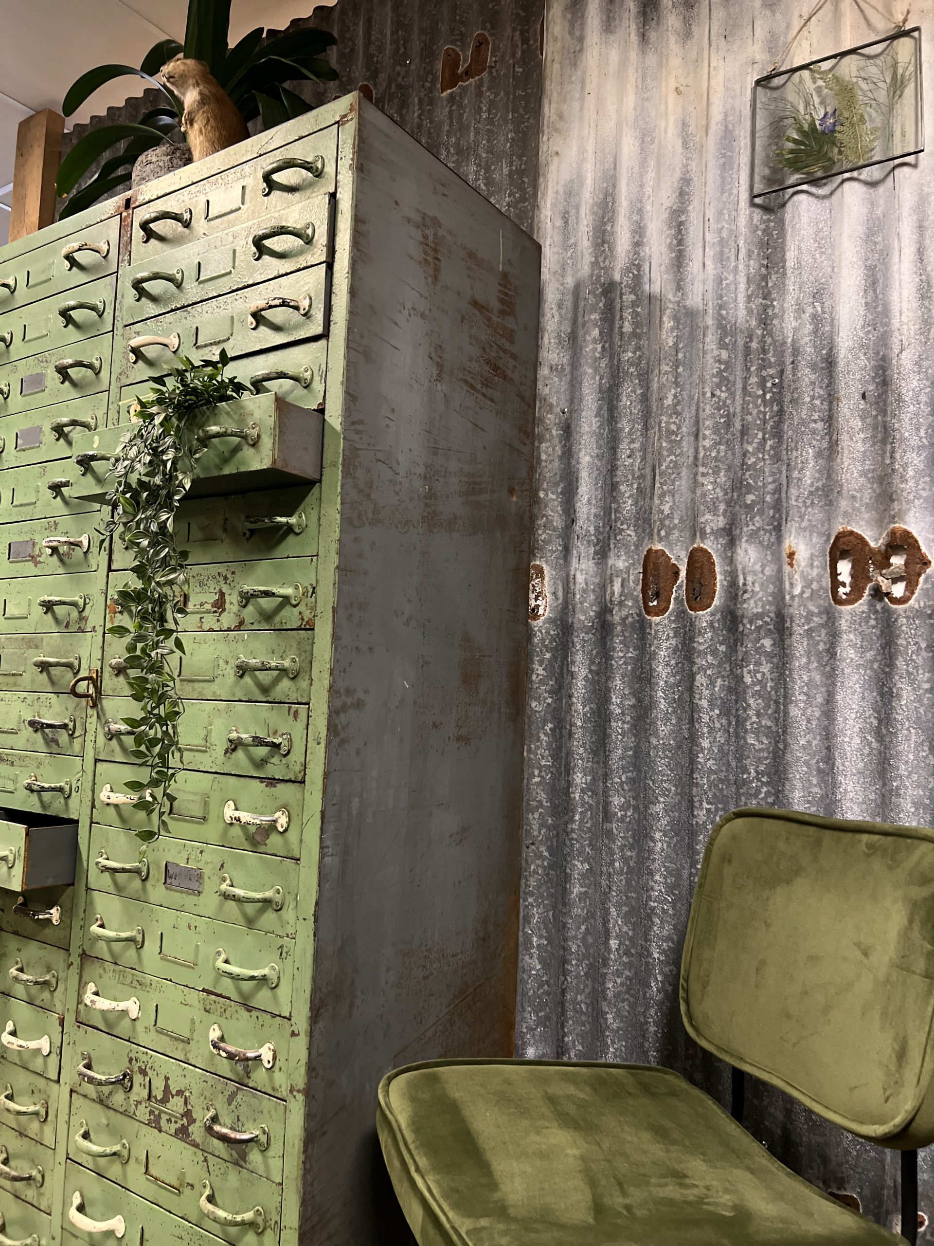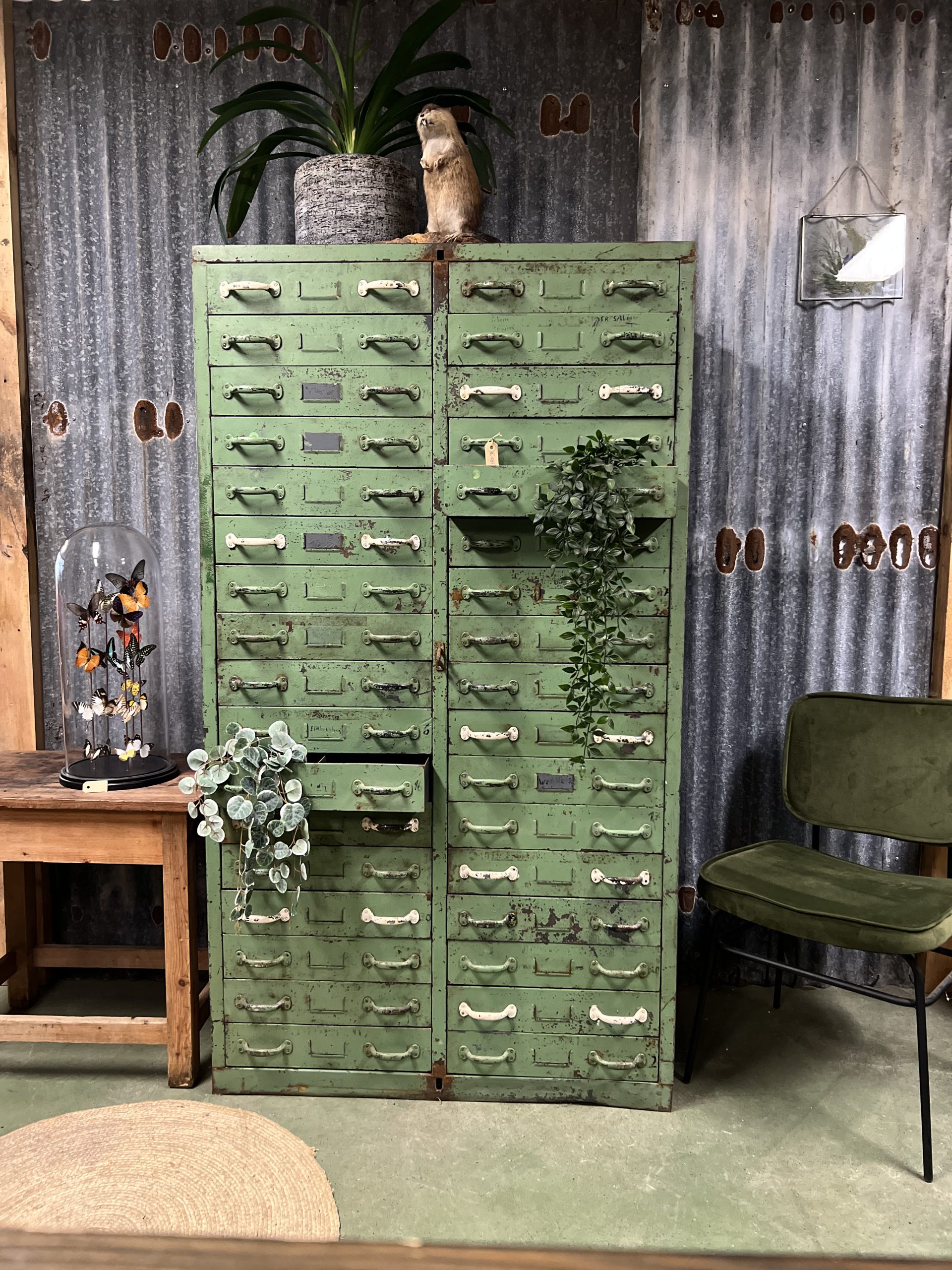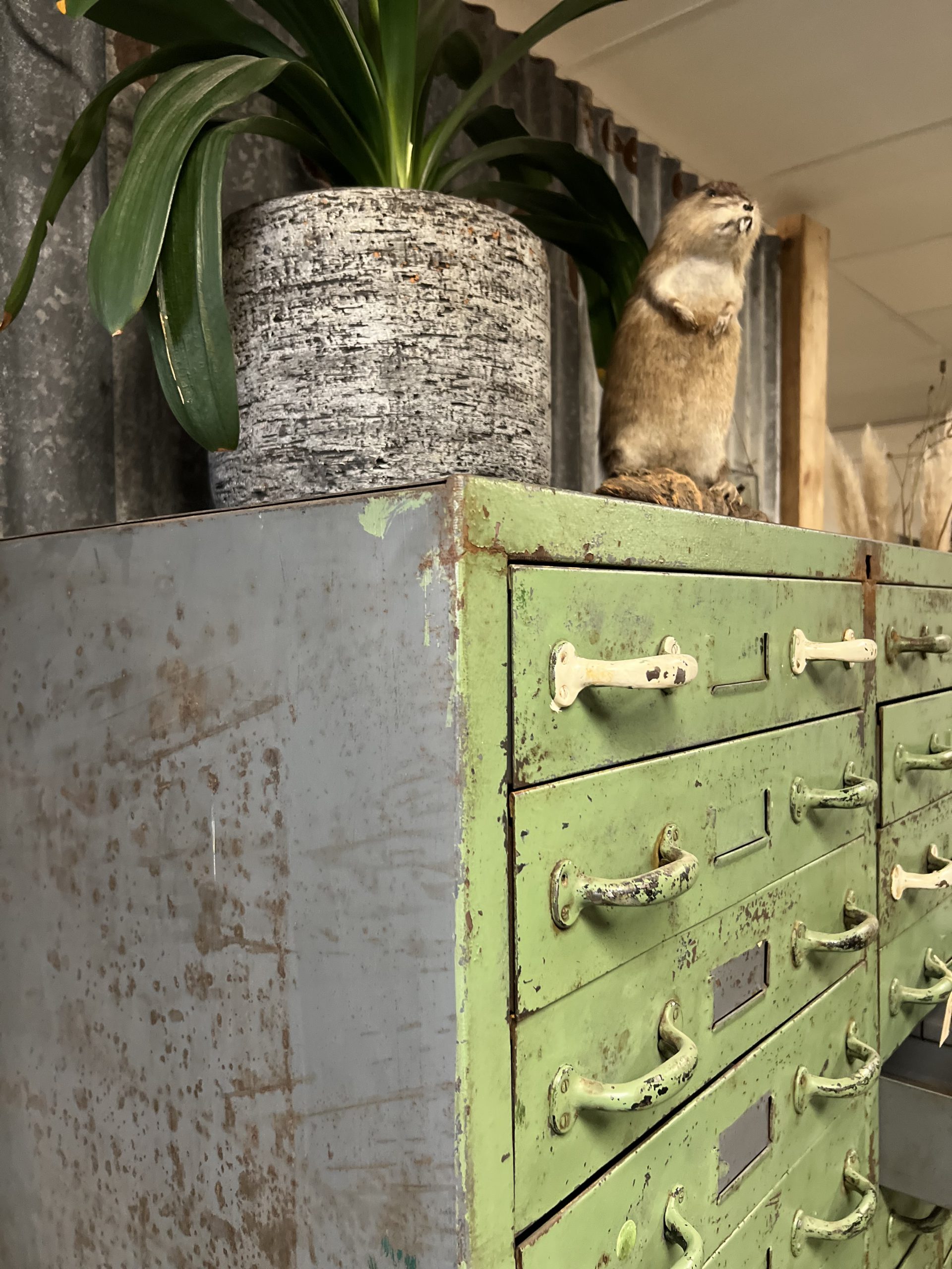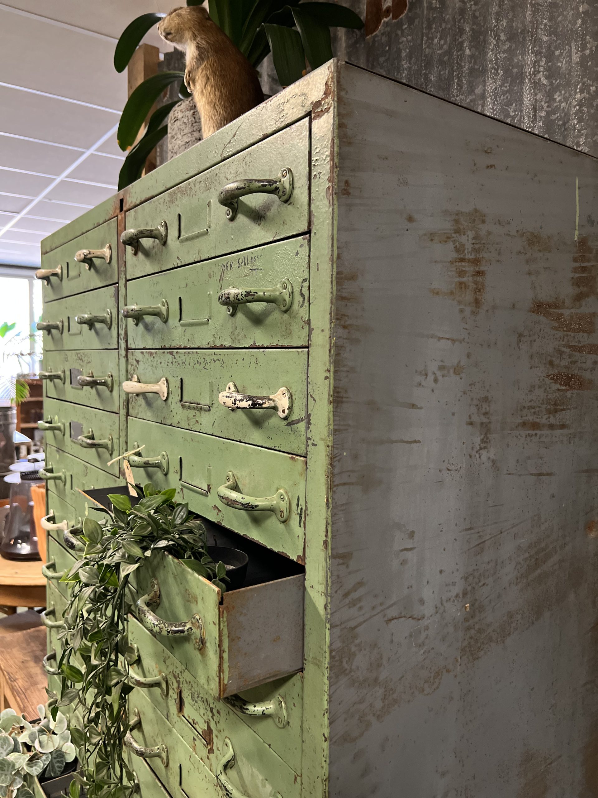 Metalen ladekast met een zee aan opbergruimte. Reseda groene voorkant, beide zijdes van deze kast zijn grijs.