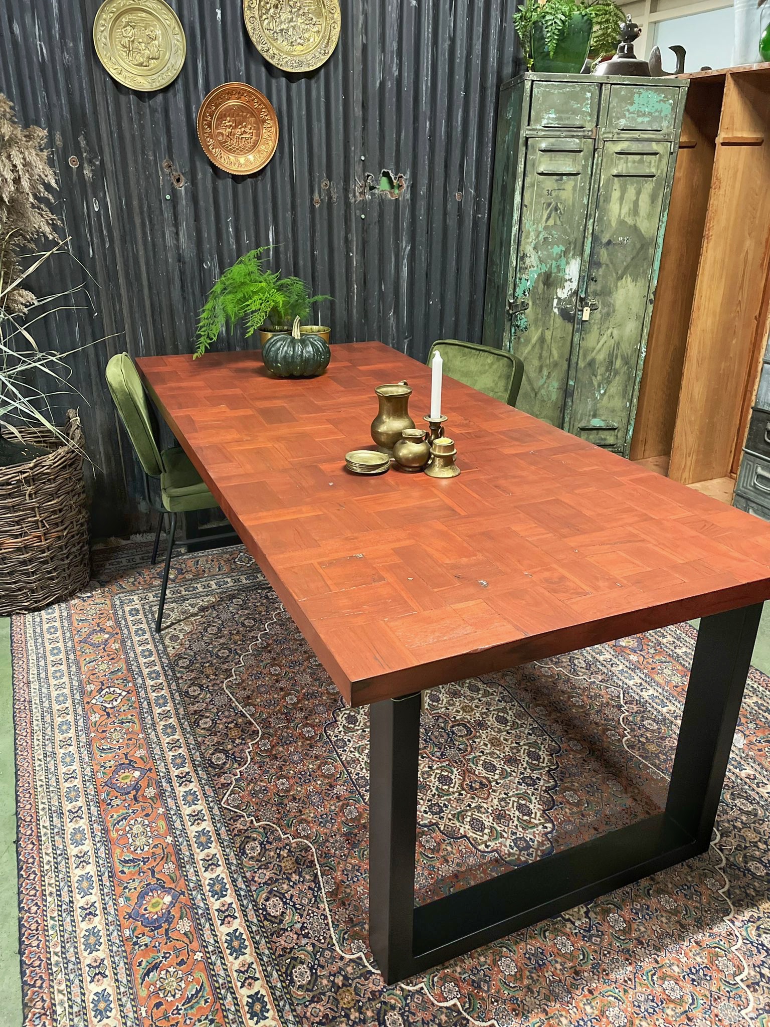 Nieuwe eettafel met ingelegd hout en zwarte stalen poten.