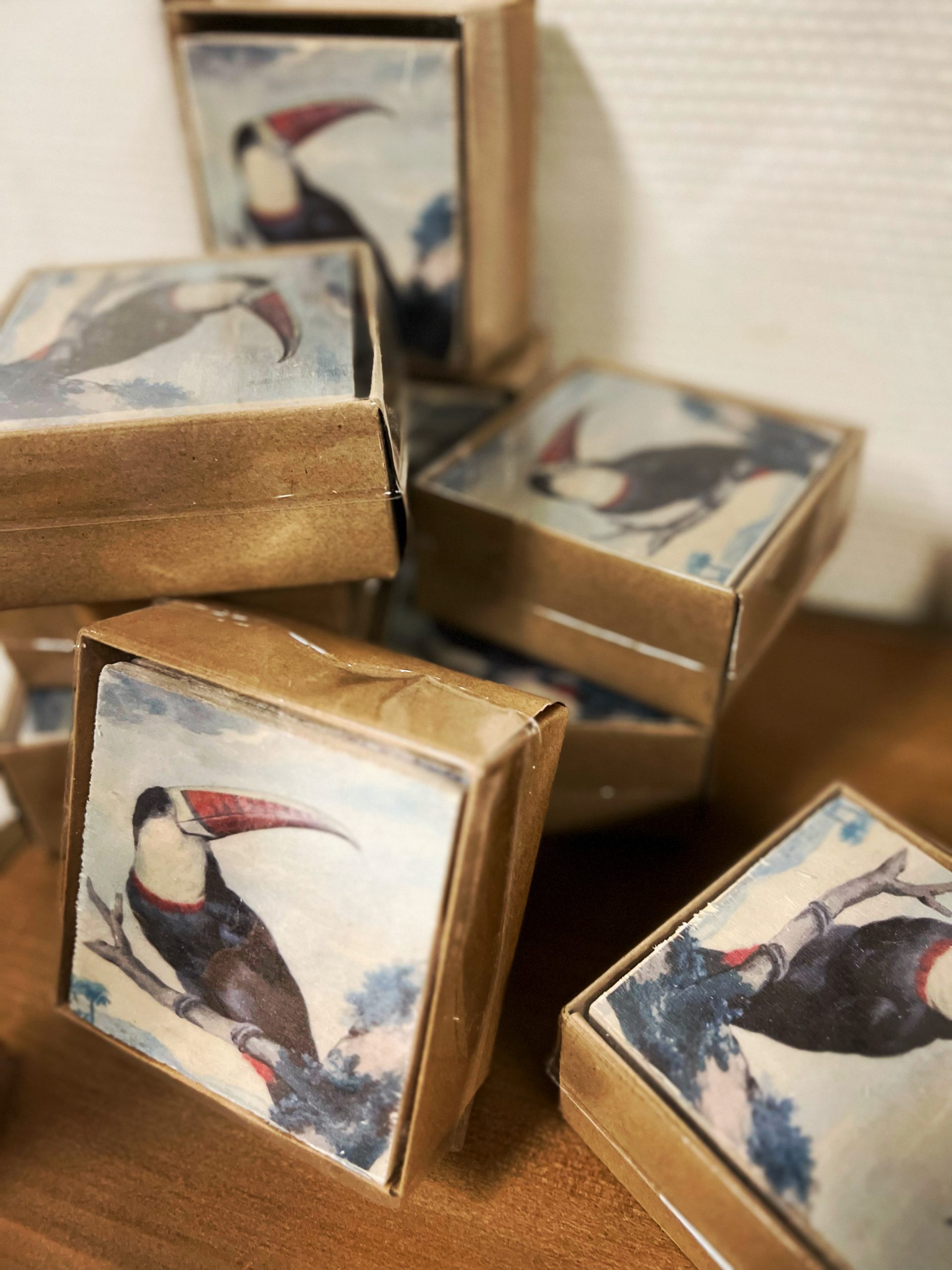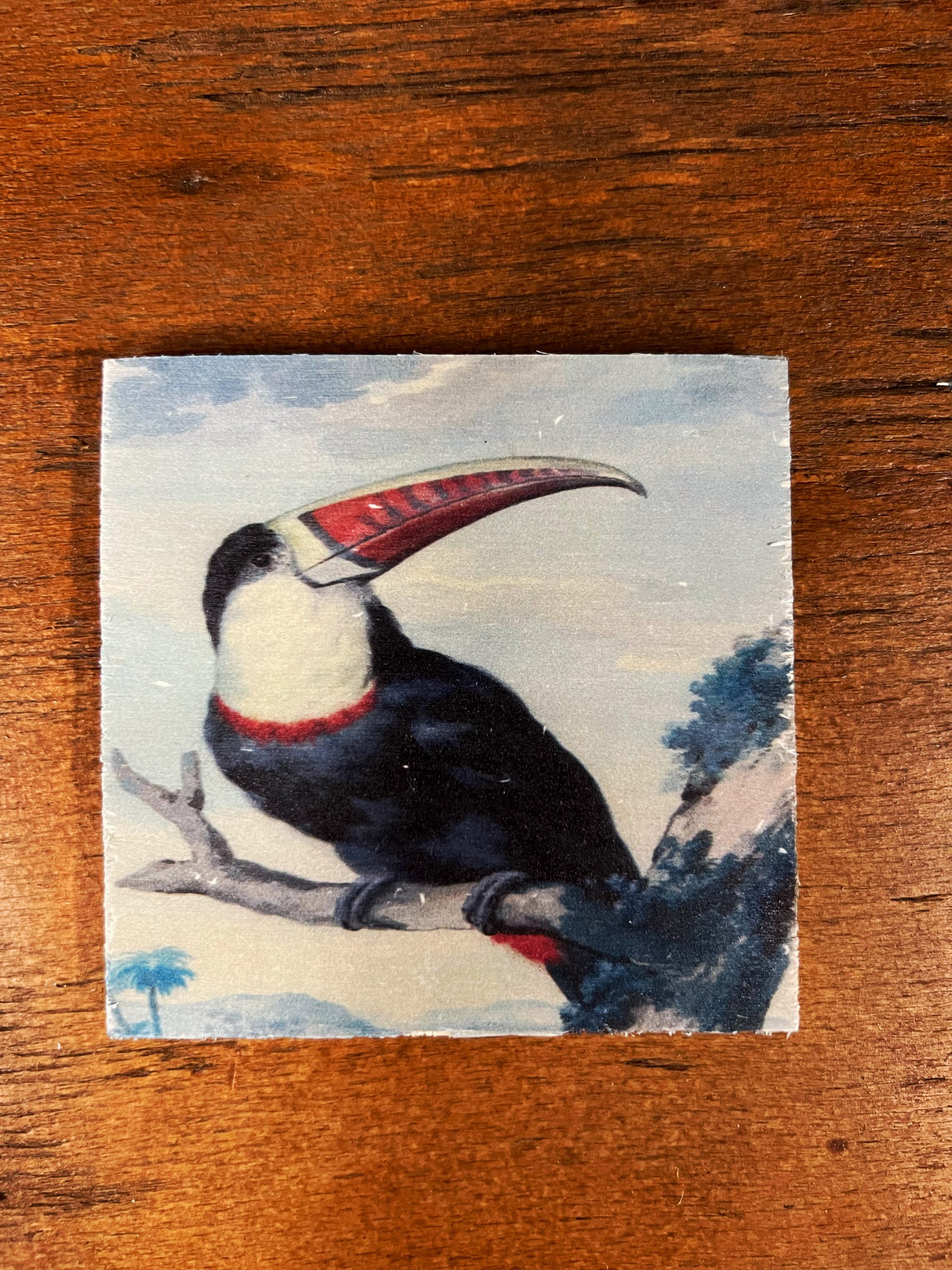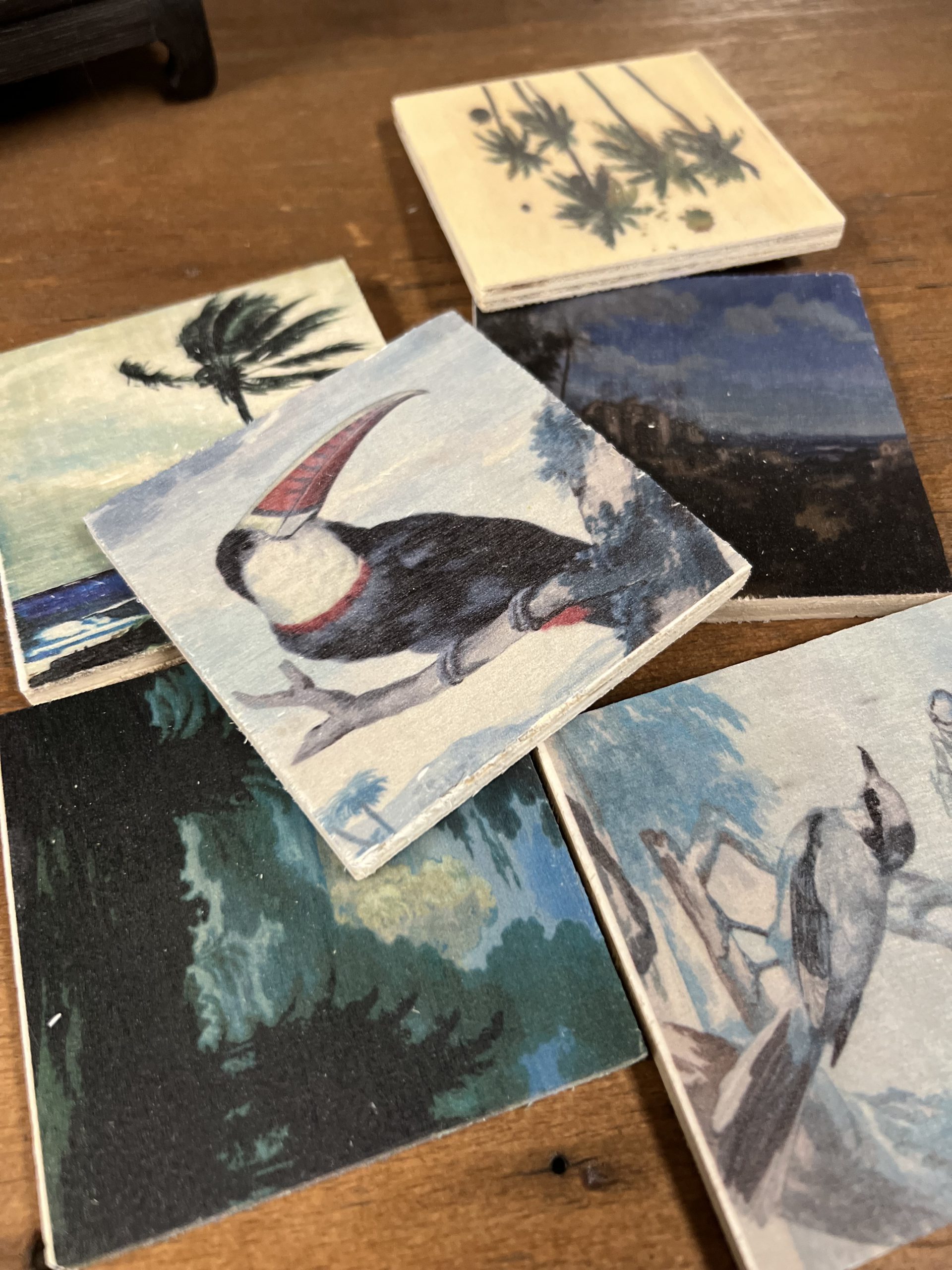 Set van 6 houten onderzetters met mooie tropische prentjes.