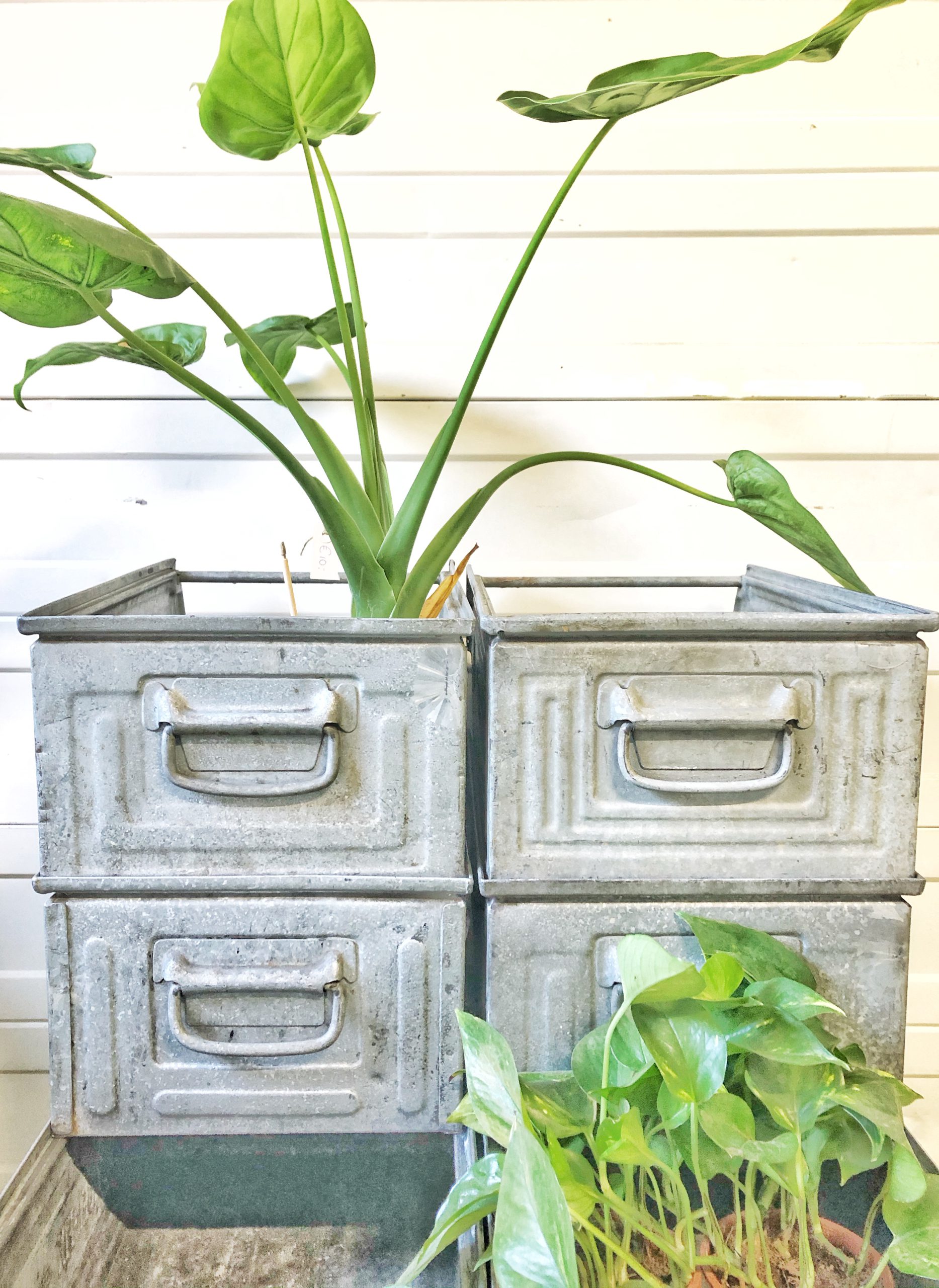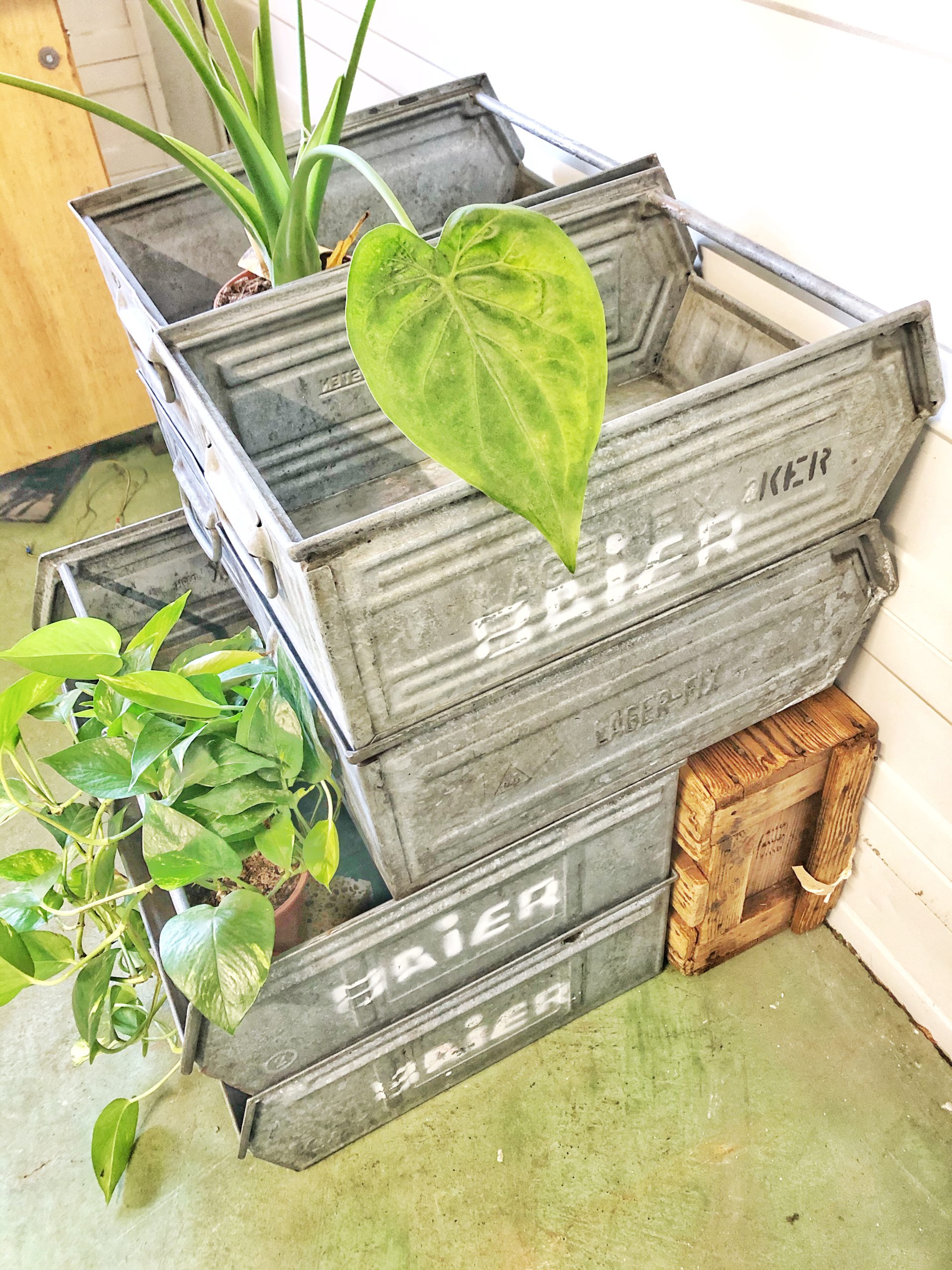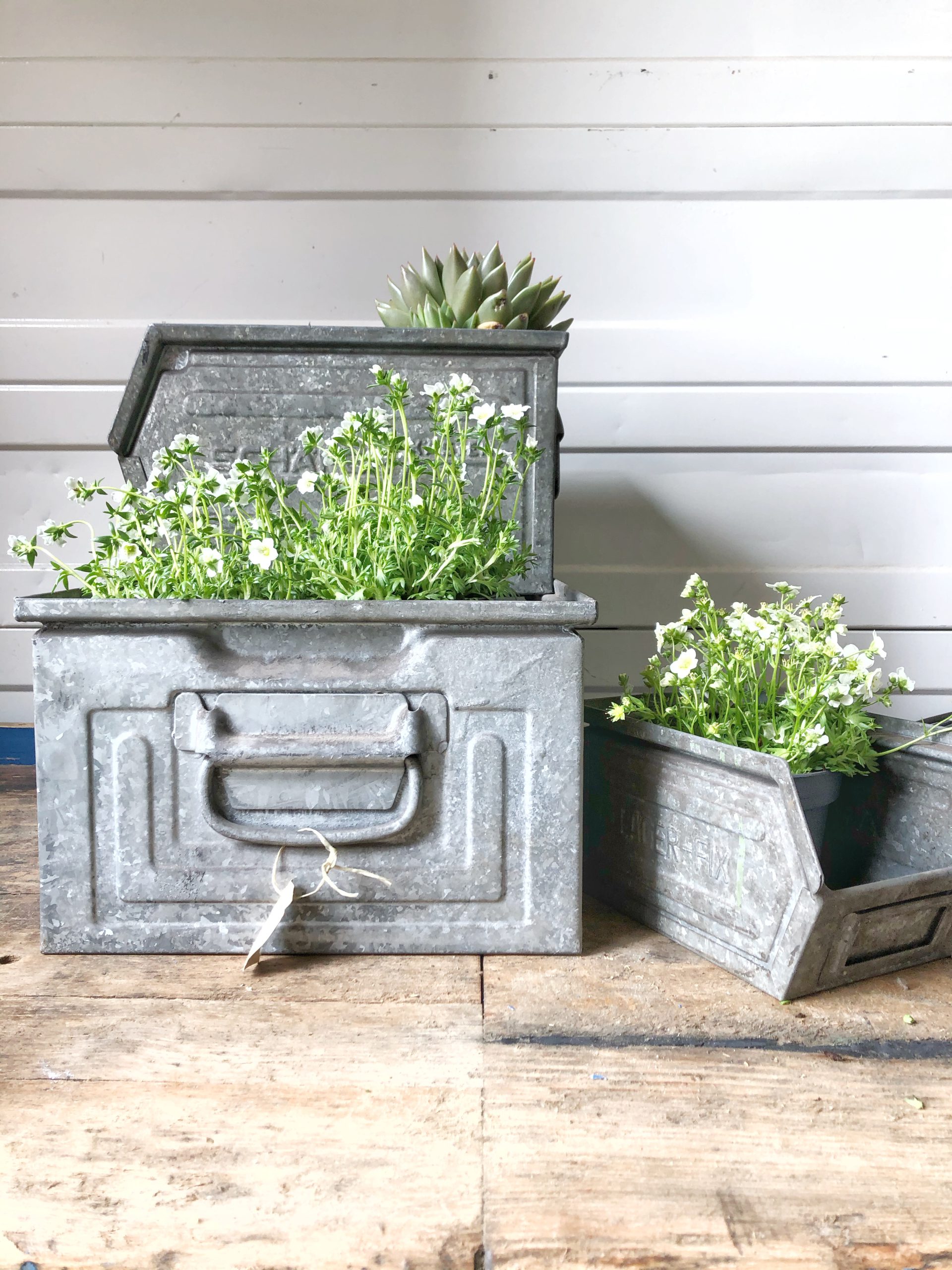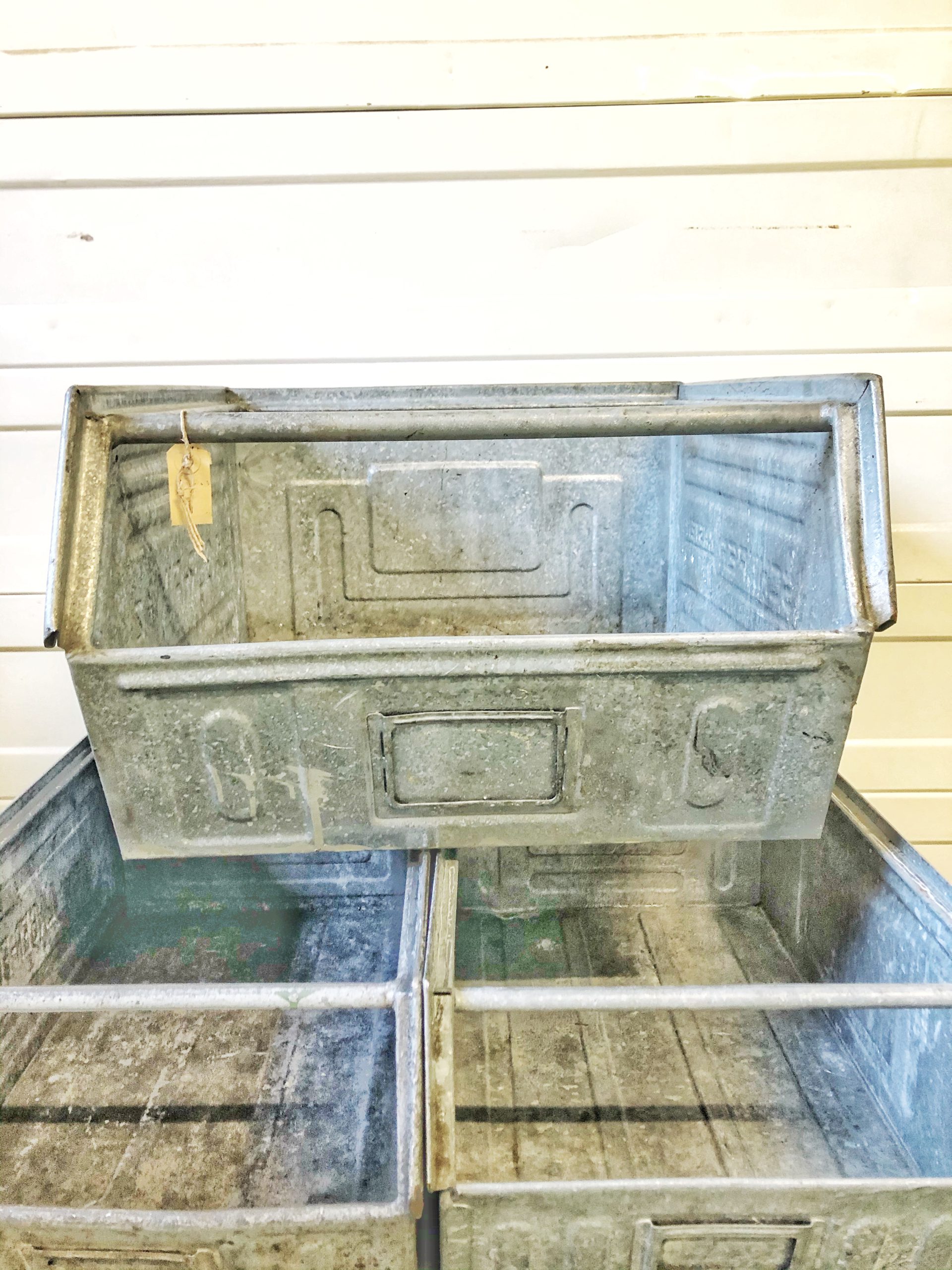Ook leuk voor in de tuin, oude zinken stapelbakken. Meerdere op voorraad, gebruikerssporen variëren.