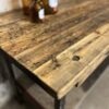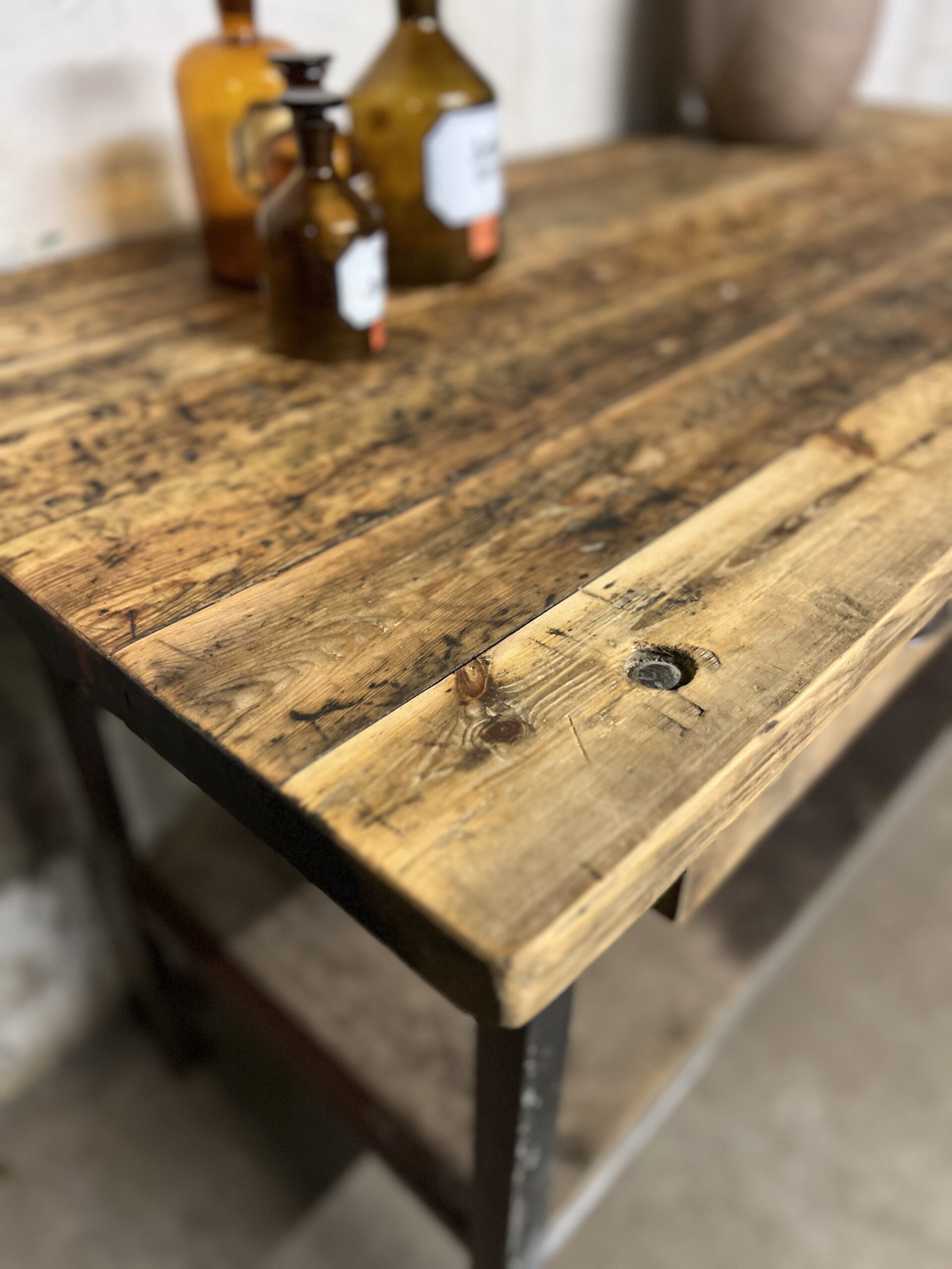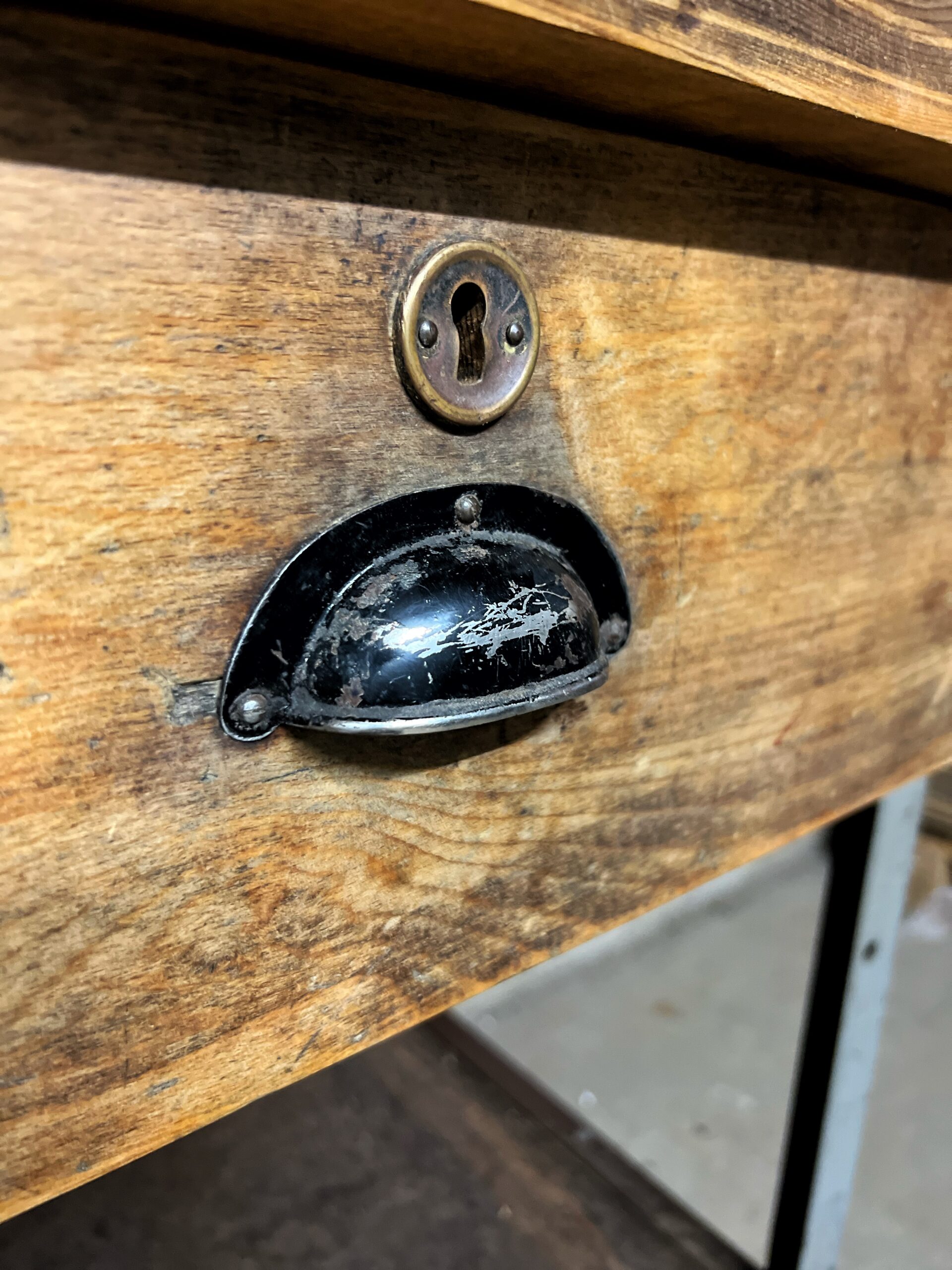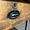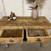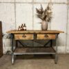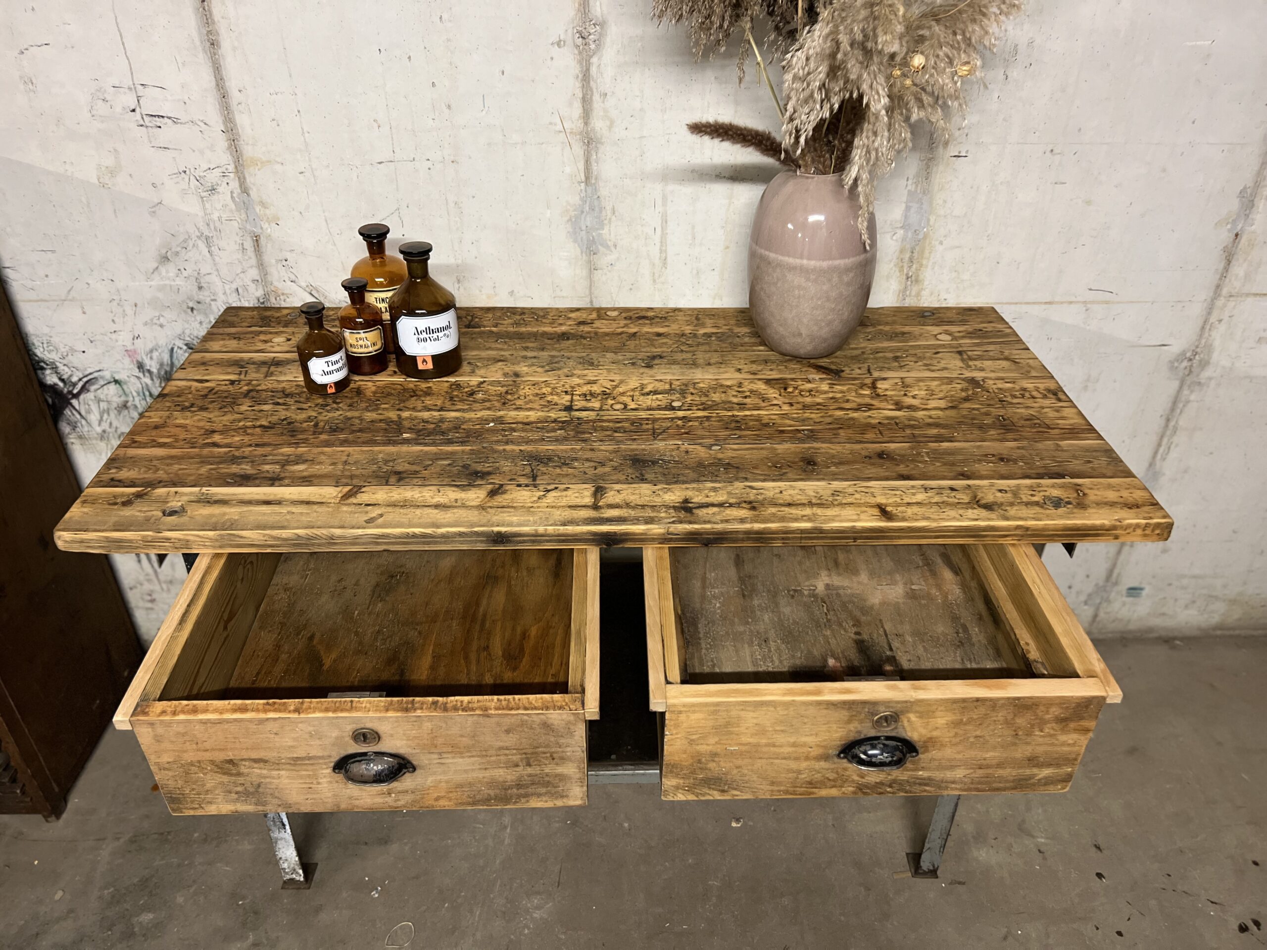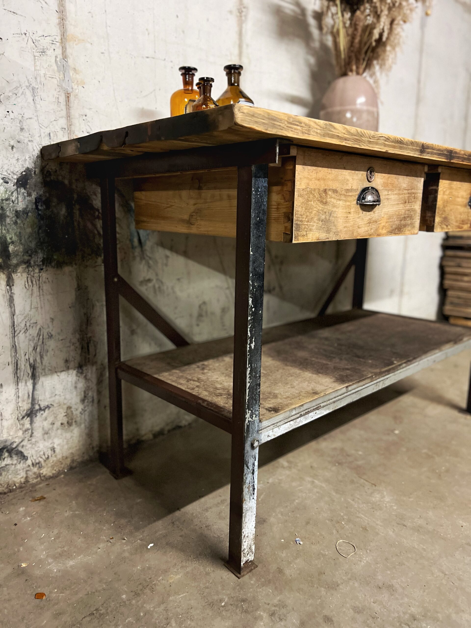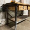 stoere oude werkbank met stalen frame en houten blad met 2 lades en de originele greepjes.