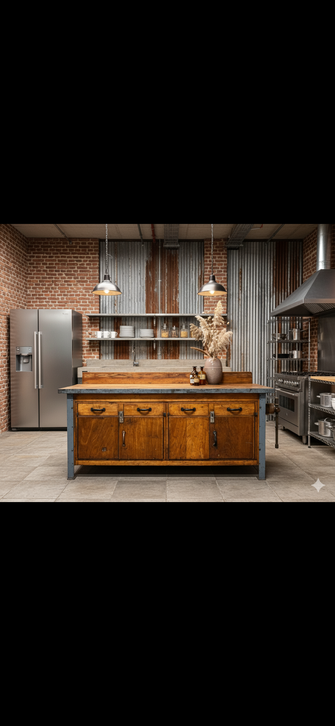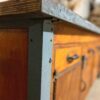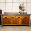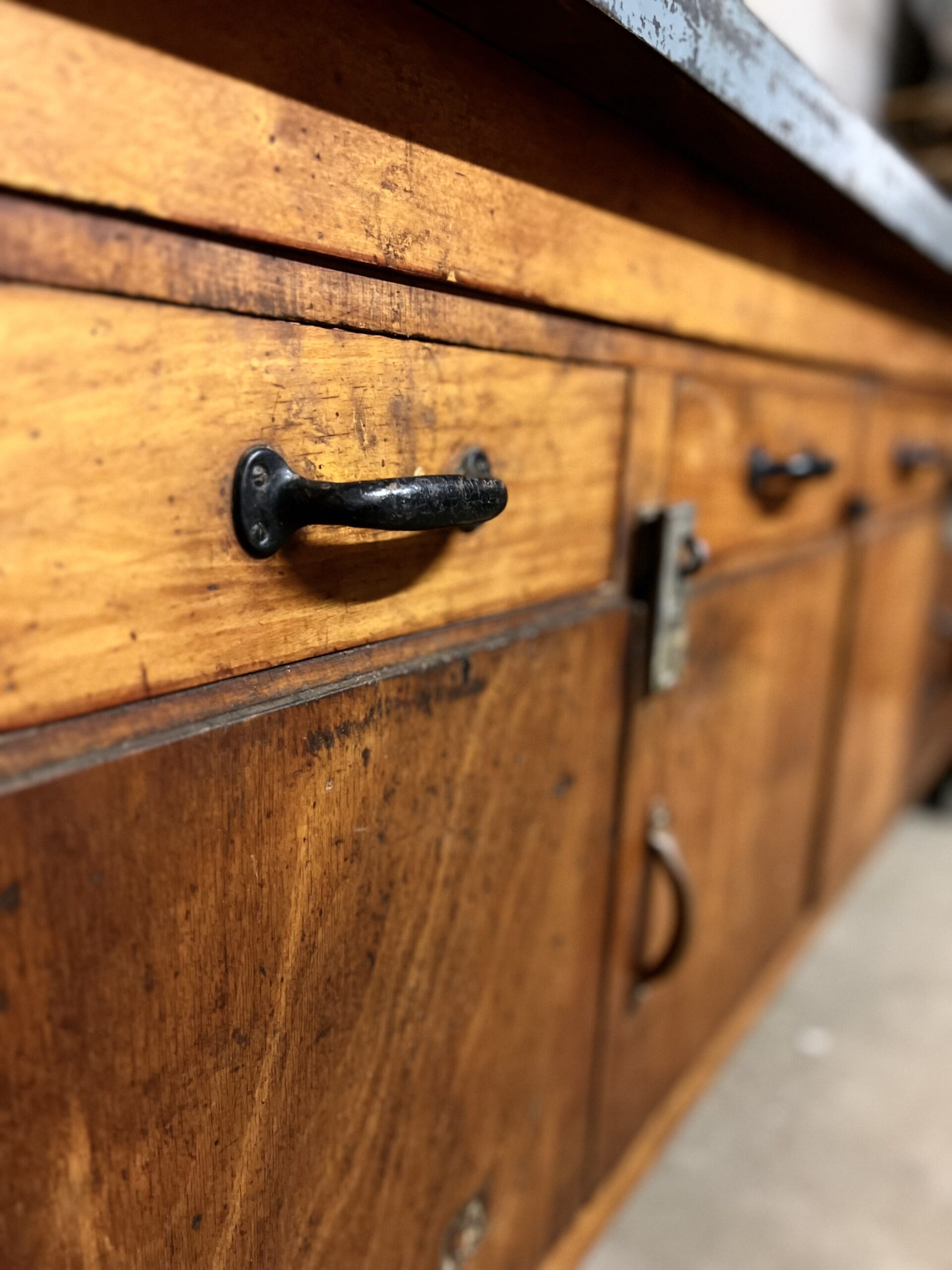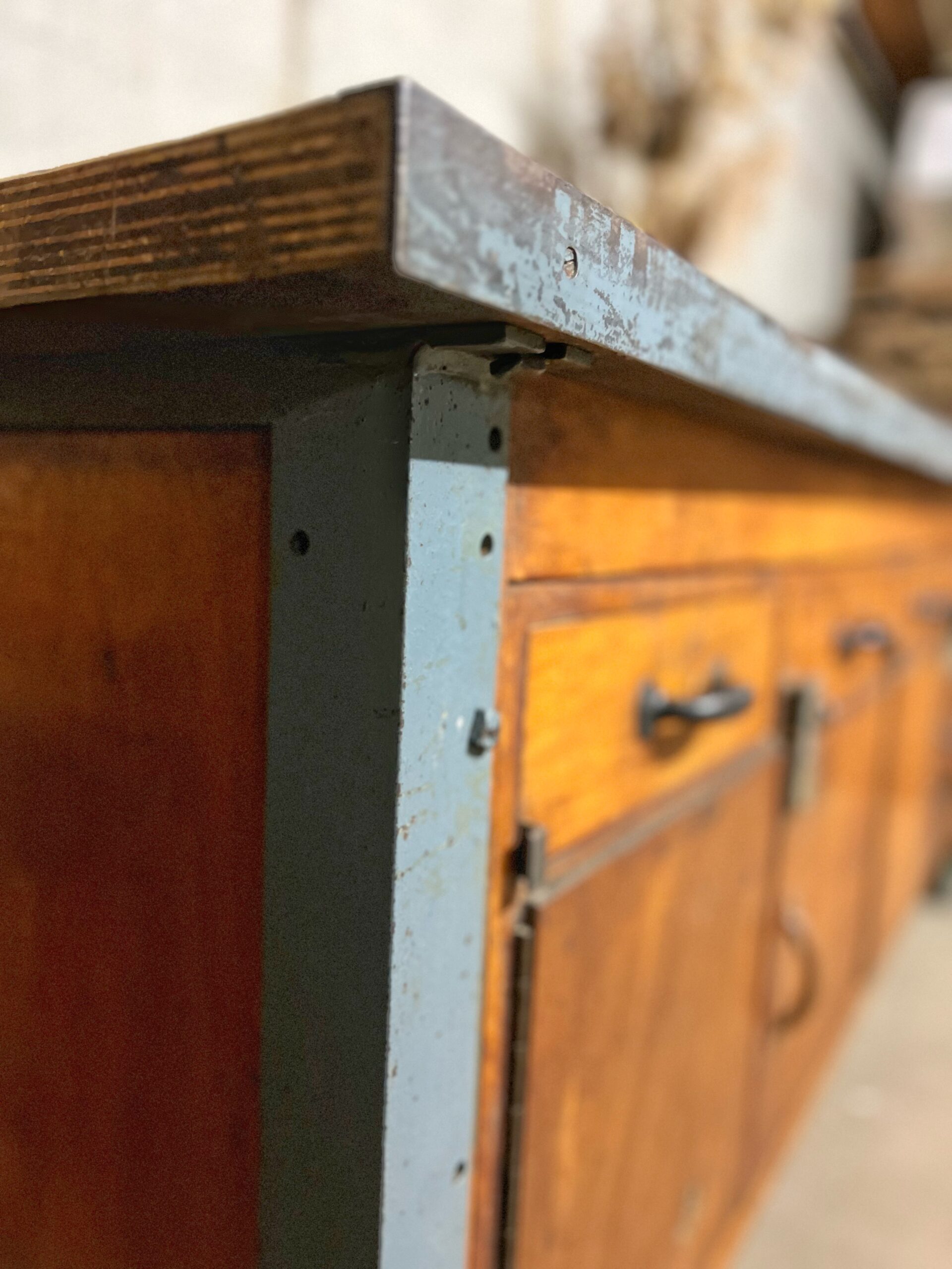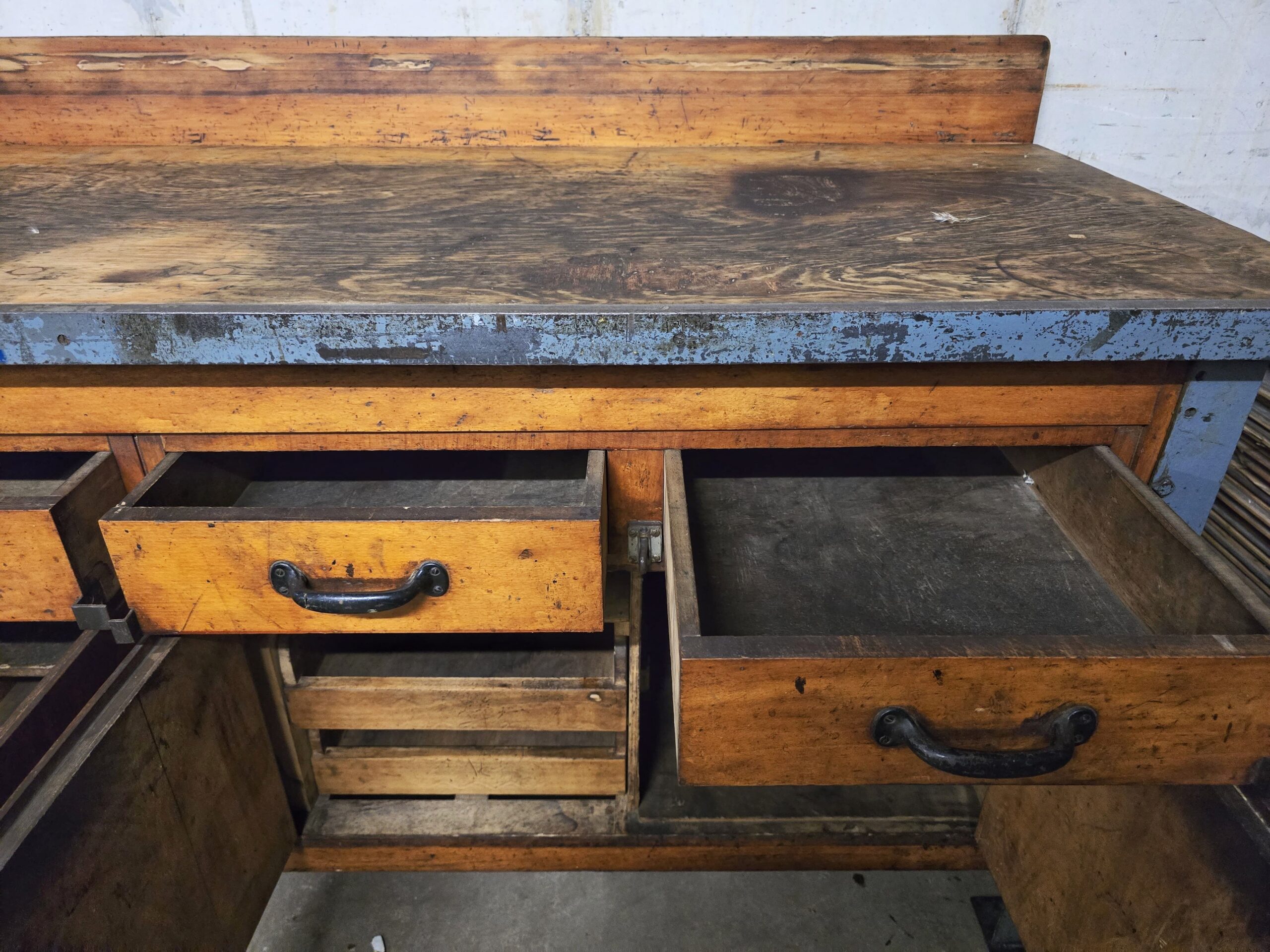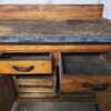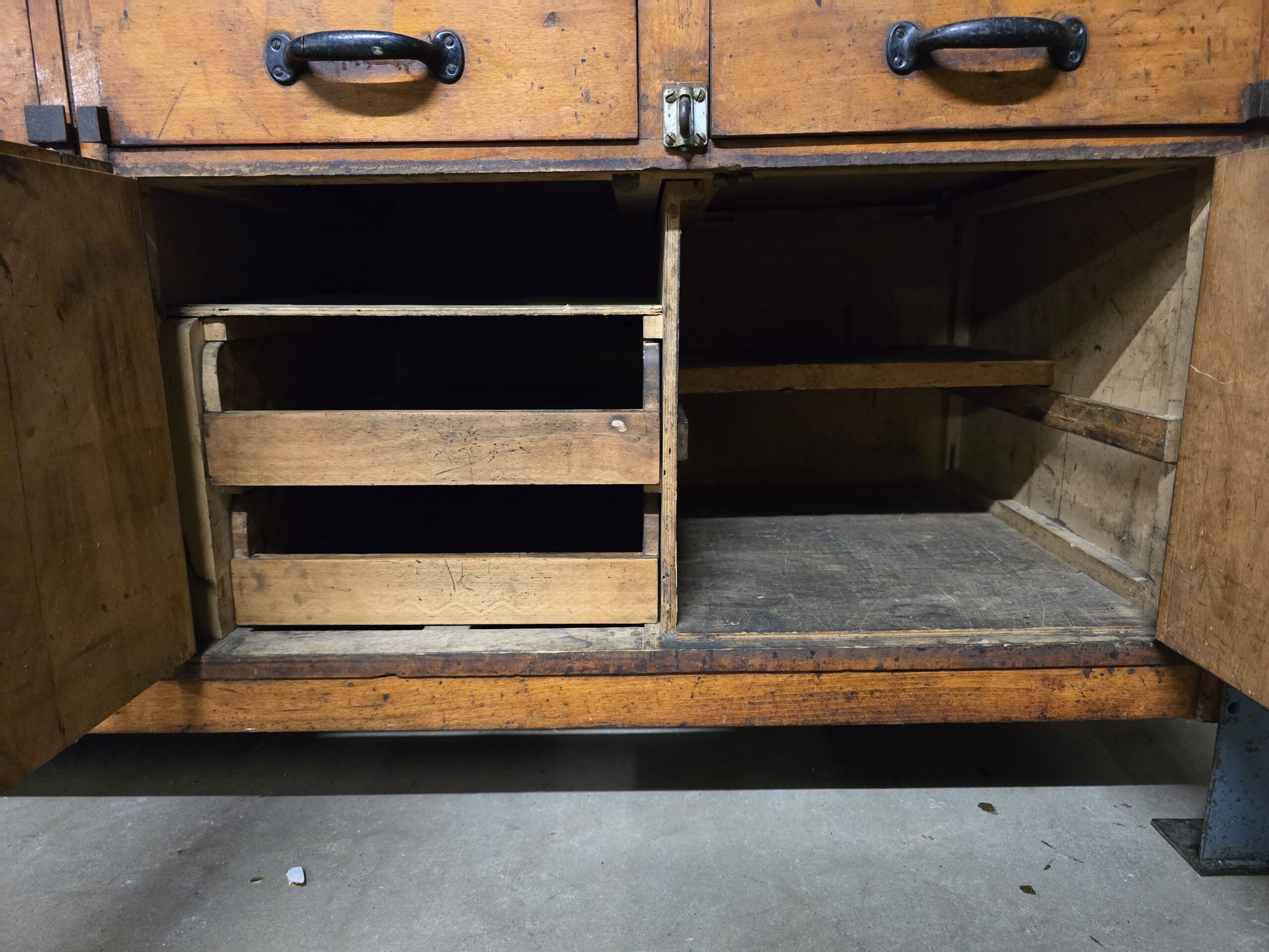 Mooie oude houten werkbank met flink wat opbergruimte en een stalen frame.