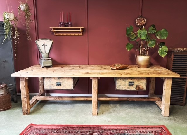 Grote houten werkbank met 2 ruime laden. Mooi origineel beslag en grote bouten in het blad.