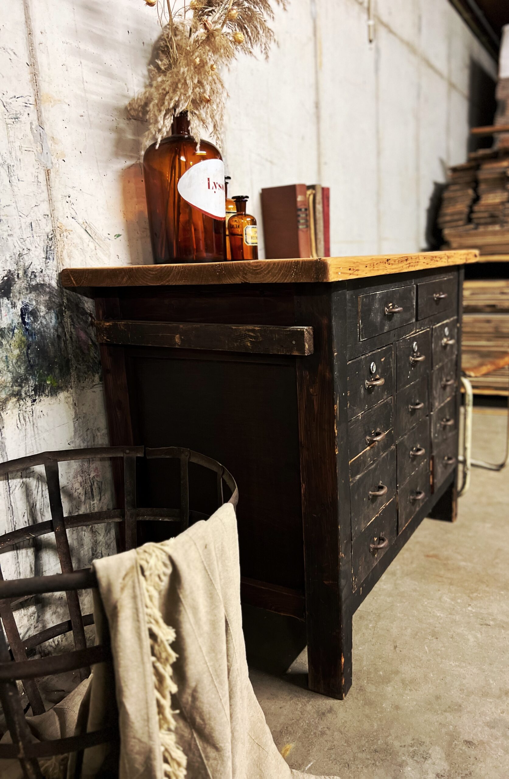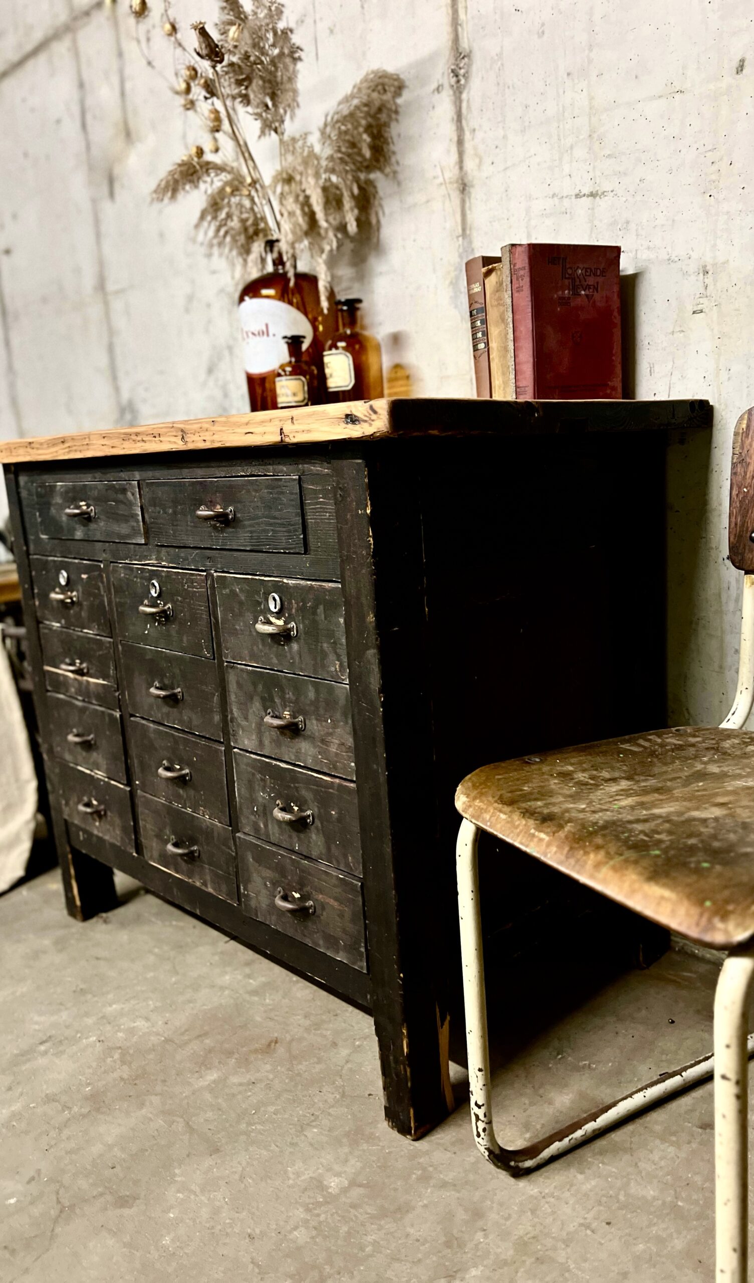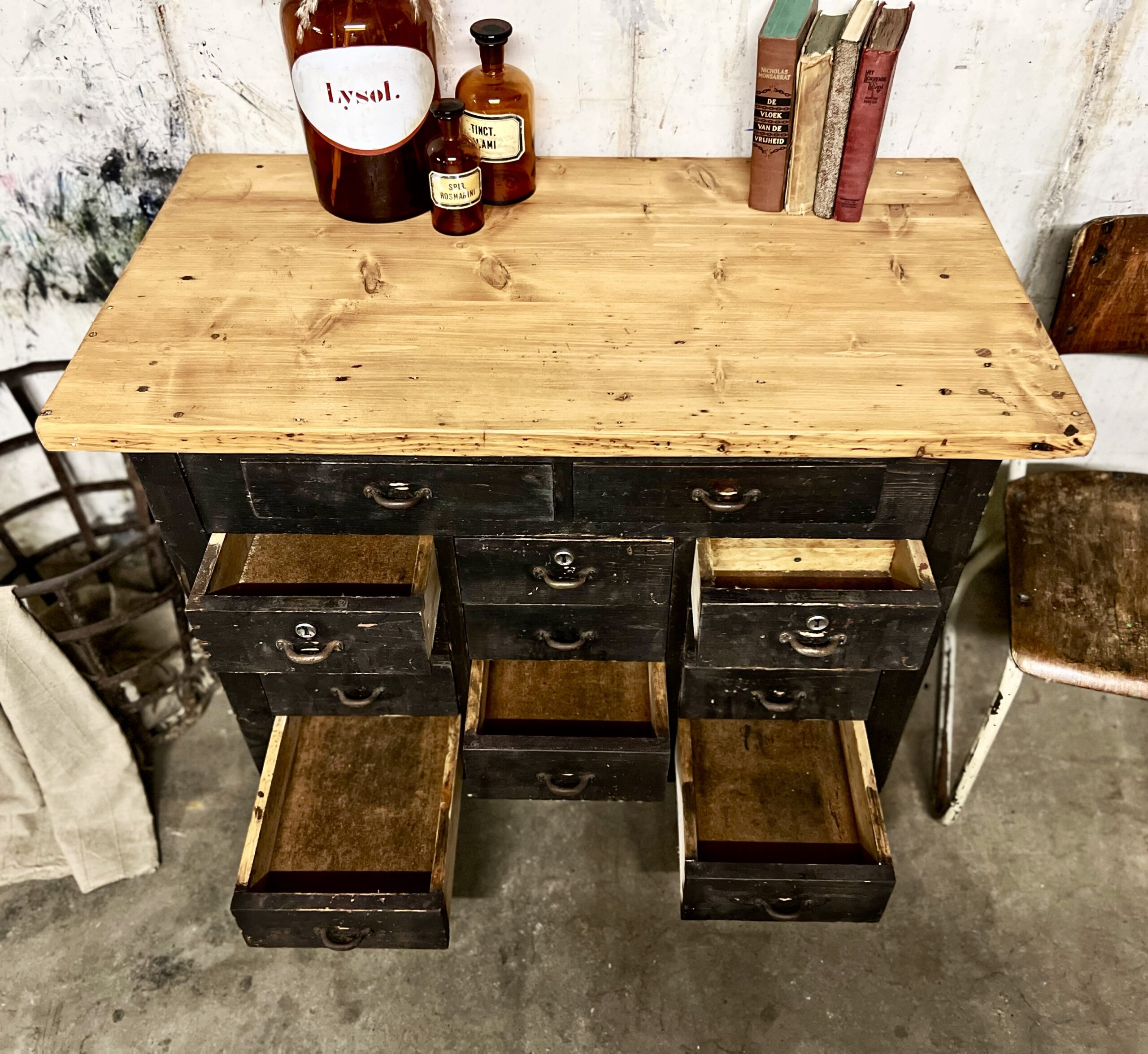 Prachtige oude houten werkbank met 14 lades waarvan enkele met een vakverdeling. Handig voor al je kleine spulletjes.