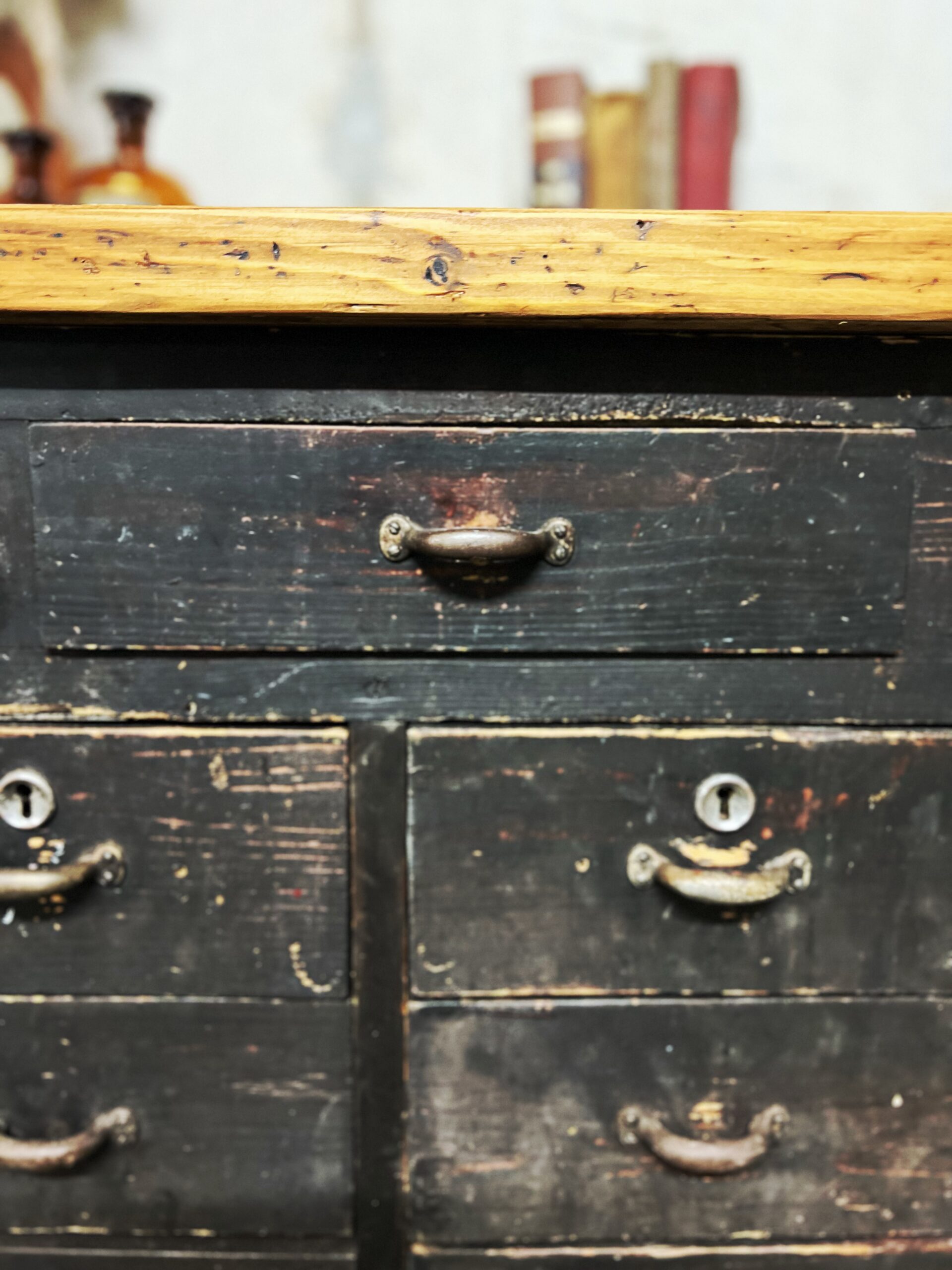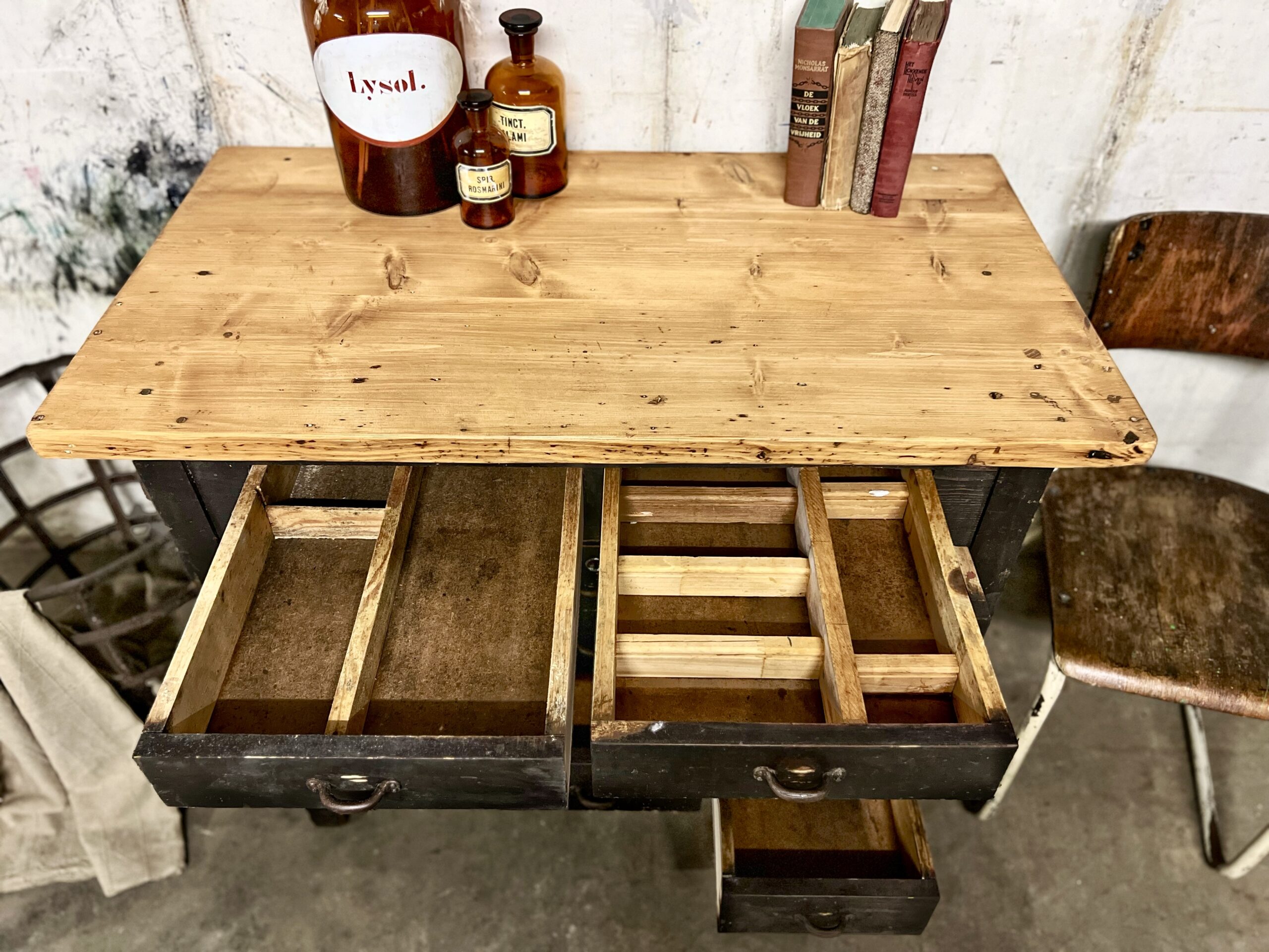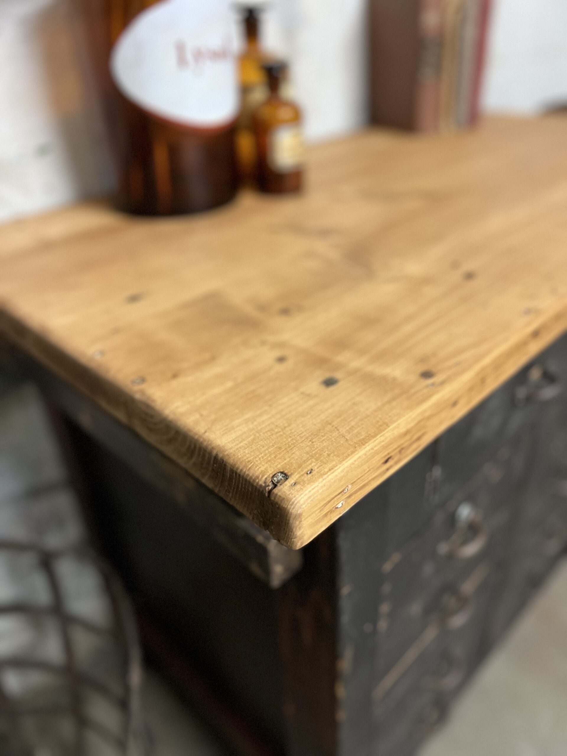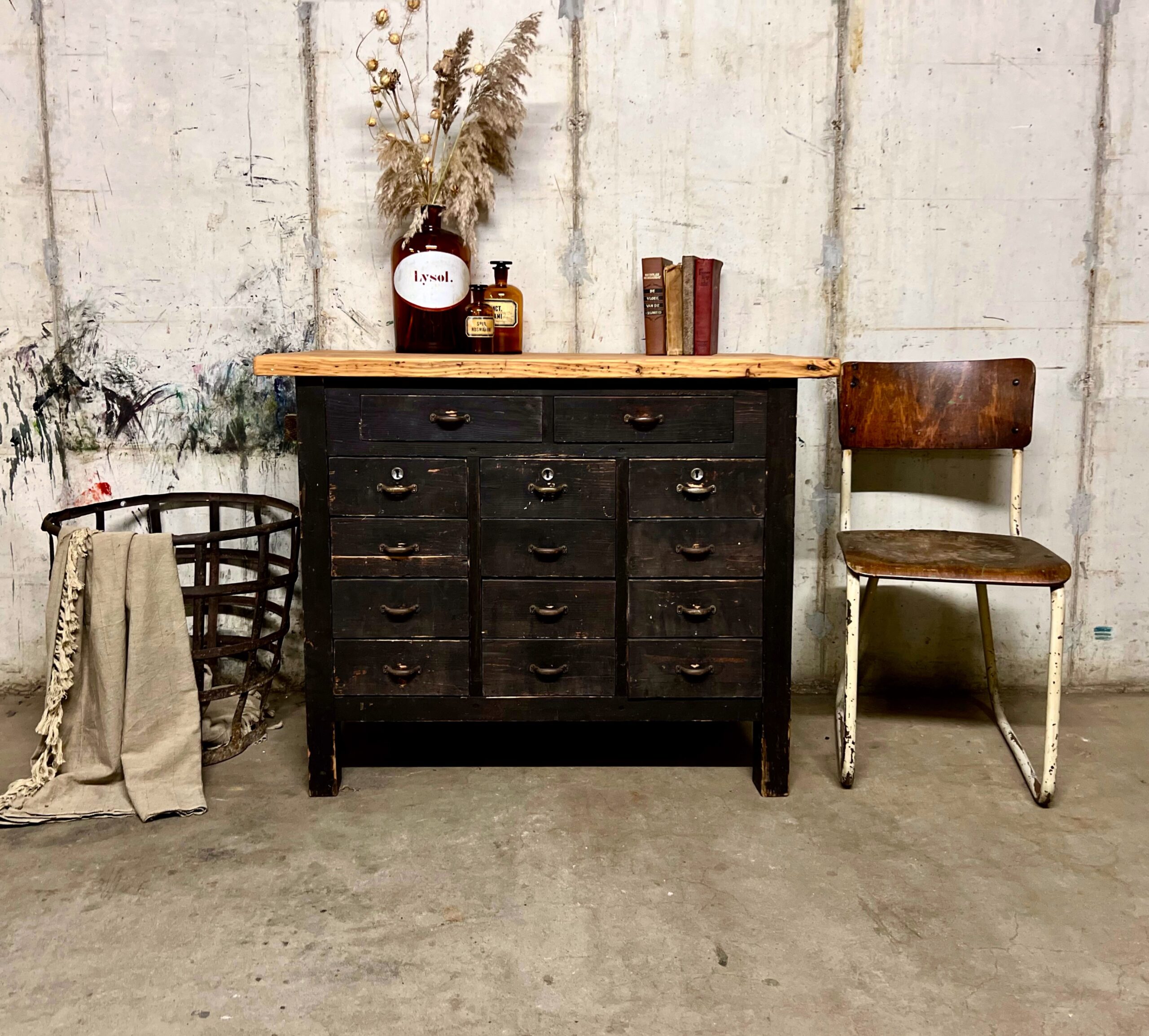 Prachtige oude houten werkbank met 14 lades waarvan enkele met een vakverdeling. Handig voor al je kleine spulletjes.